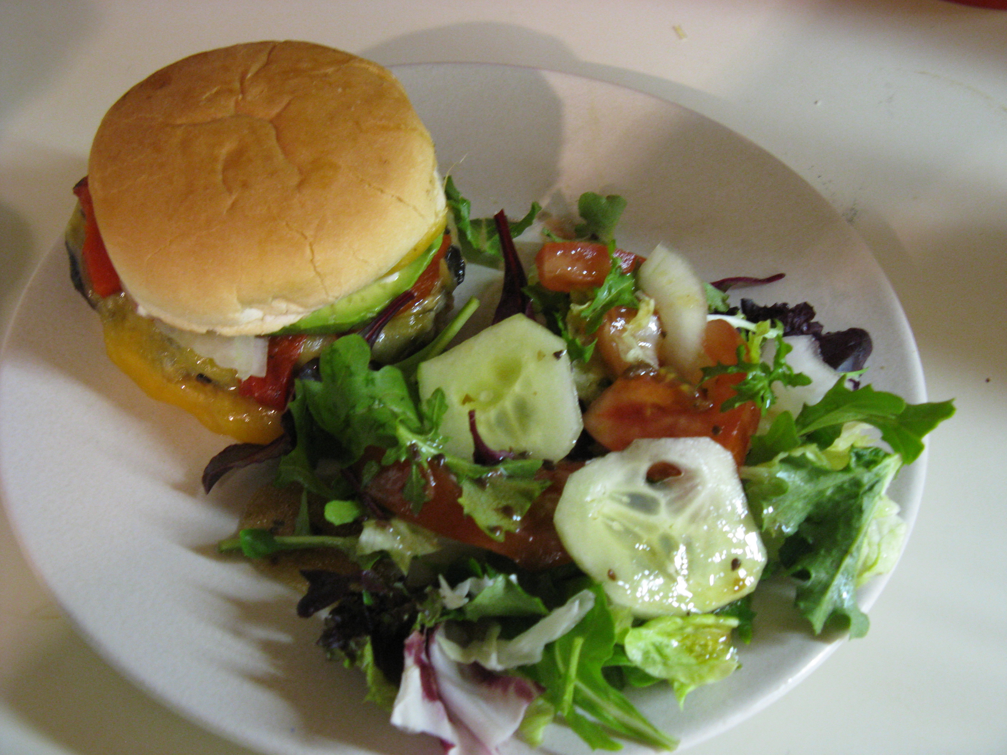 I serve this with a tossed salad of mixed greens, tomatoes, cucumbers, onions, etc. with Annie’s Shiitake Sesame dressing.