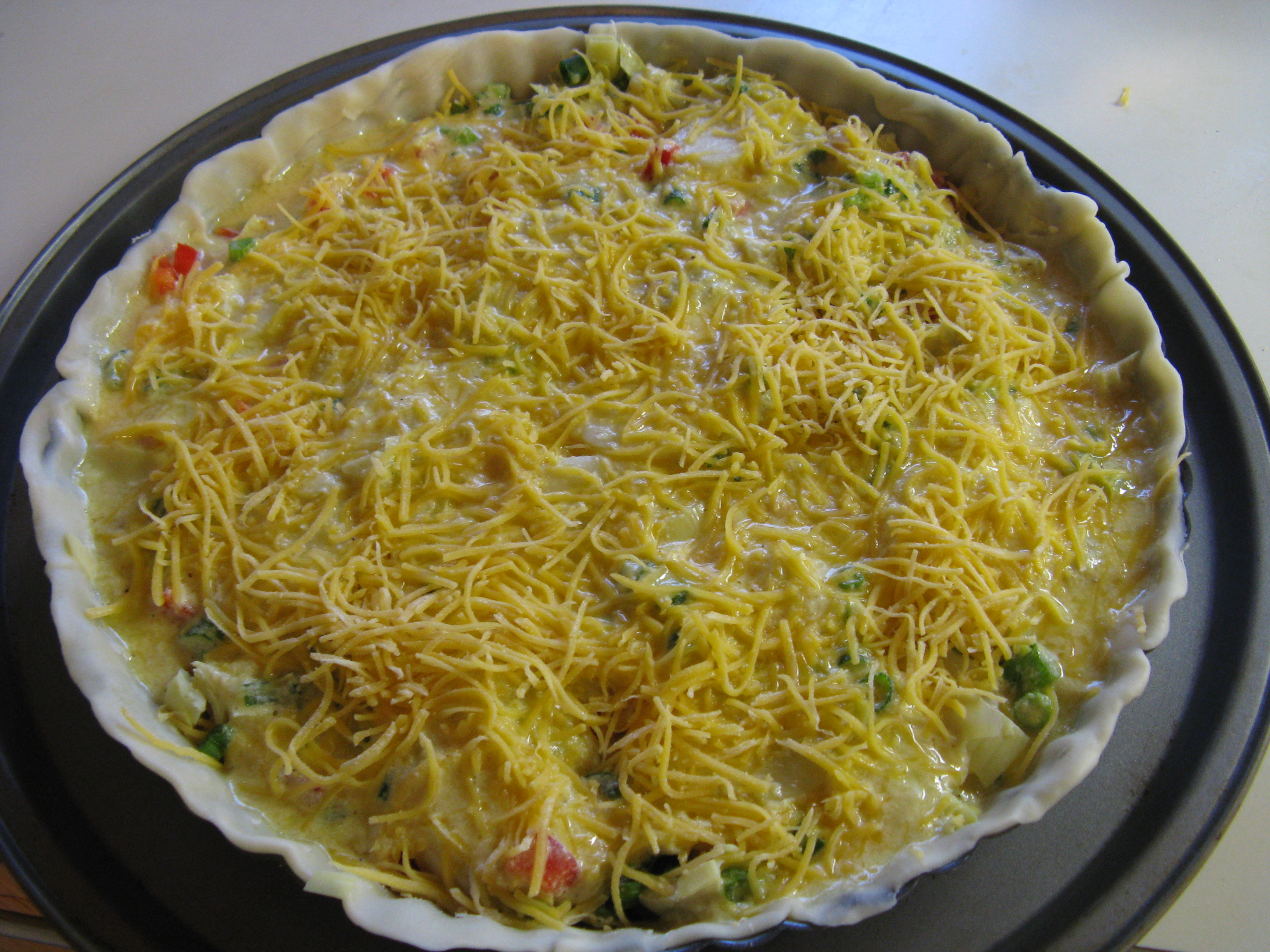 Layer half of the potatoes, artichokes, red peppers and green onions in the crust. Sprinkle the top with some cheddar. Repeat. Pour the half-and-half mixture over the vegetables, and top with the remaining cheddar.