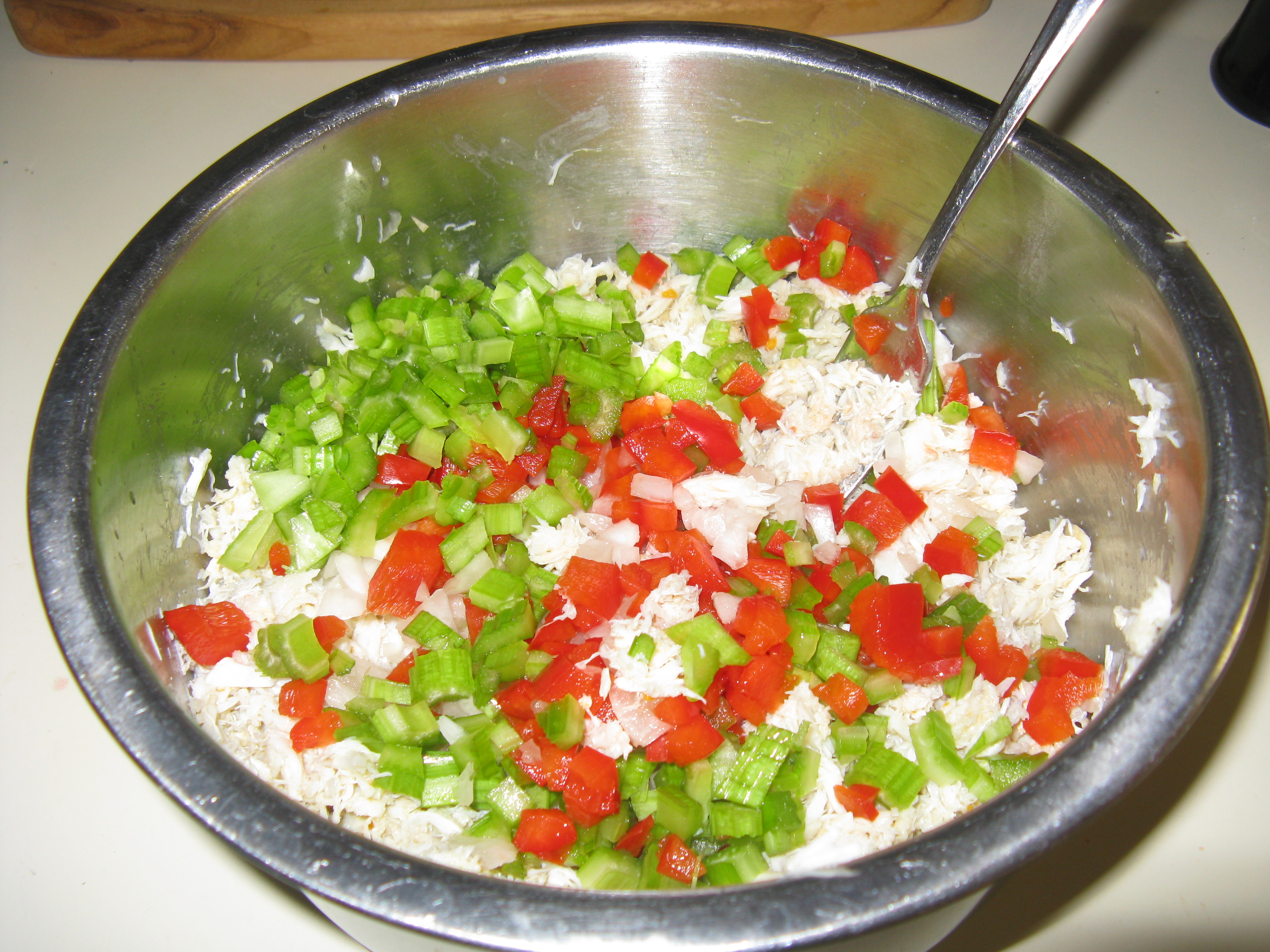 In a large mixing bowl, flake the crab meat with a fork, and sprinkle it with the fresh lemon juice. Add the red pepper, celery and onion. Mix together.