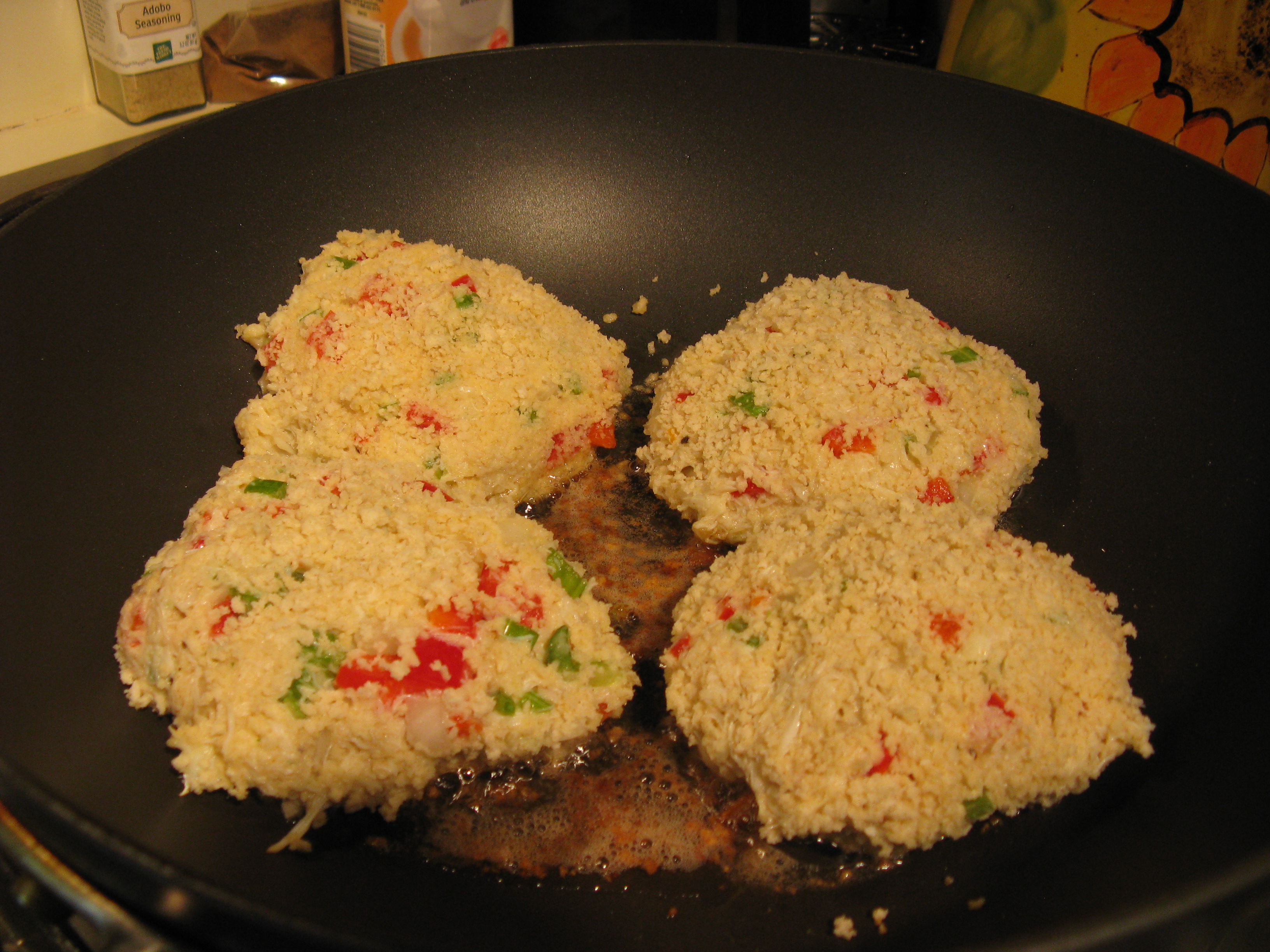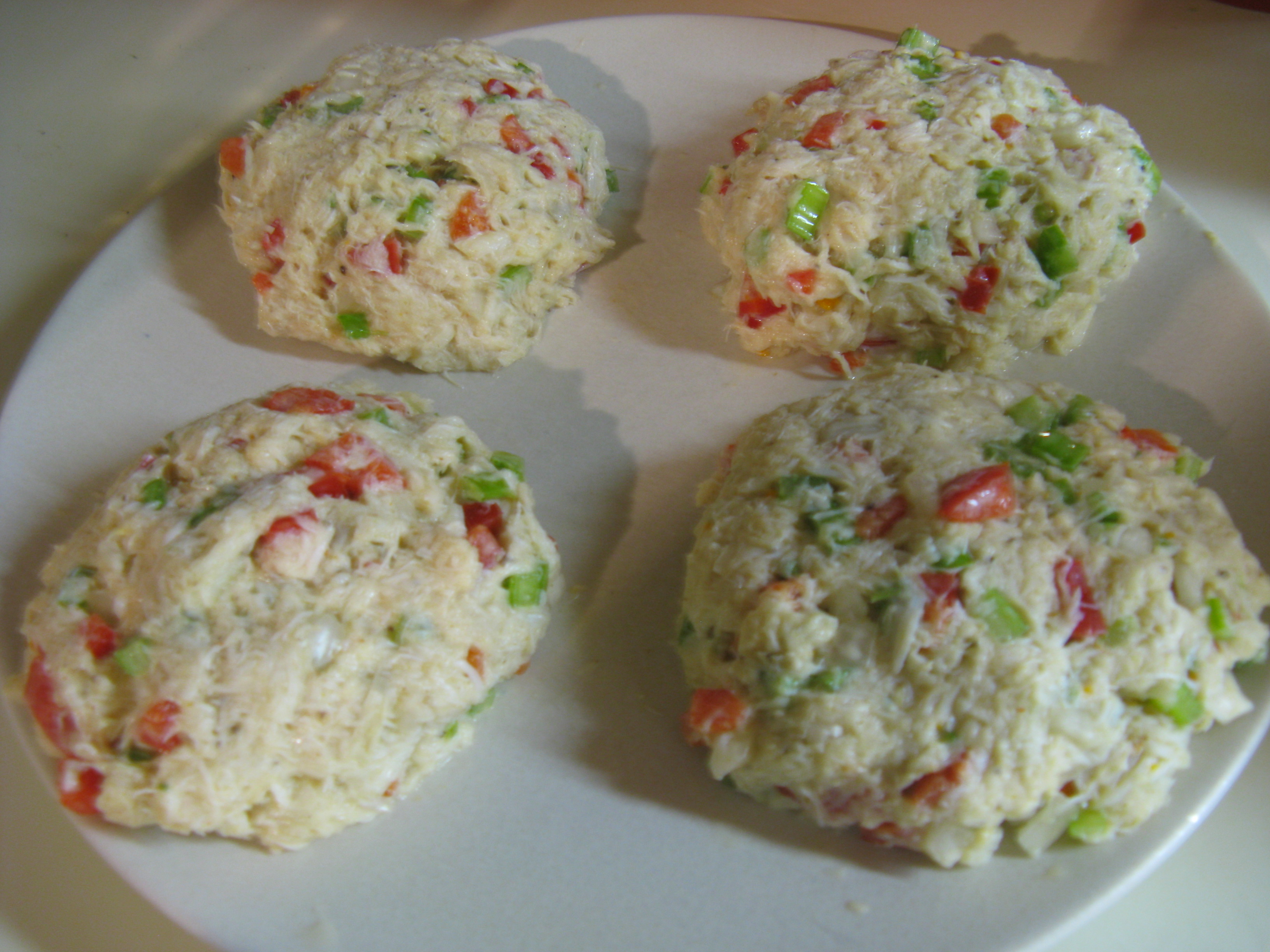 Form into 4 large patties, or 8 smaller ones. Refrigerate for at least an hour. This step is so important because it makes the cakes hold together better, especially since I leave out filler such as breadcrumbs, crackers, etc. in the mix.