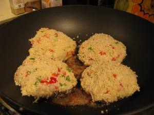 Heat the oil in a large frying pan. Dredge each cake in flour or breadcrumbs (I used panko crumbs for this batch, and really loved the texture!)
