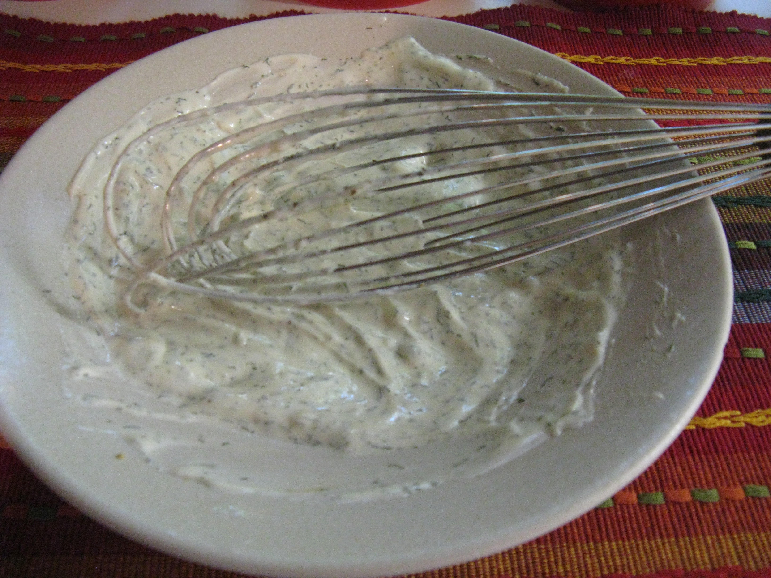 Make the dressing by whisking together the mayonnaise, white wine, mustard, dill weed, salt and pepper.