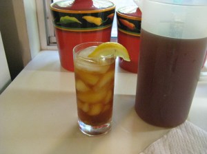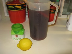 If I’m only making the tea for myself, which is usually the case, I stir in approximately ¼ cup of Truvia or Stevia (whatever “green” sweetener I have.) If I’m making this for company, I do not add sweetener to give folks the option of adding it if they want.