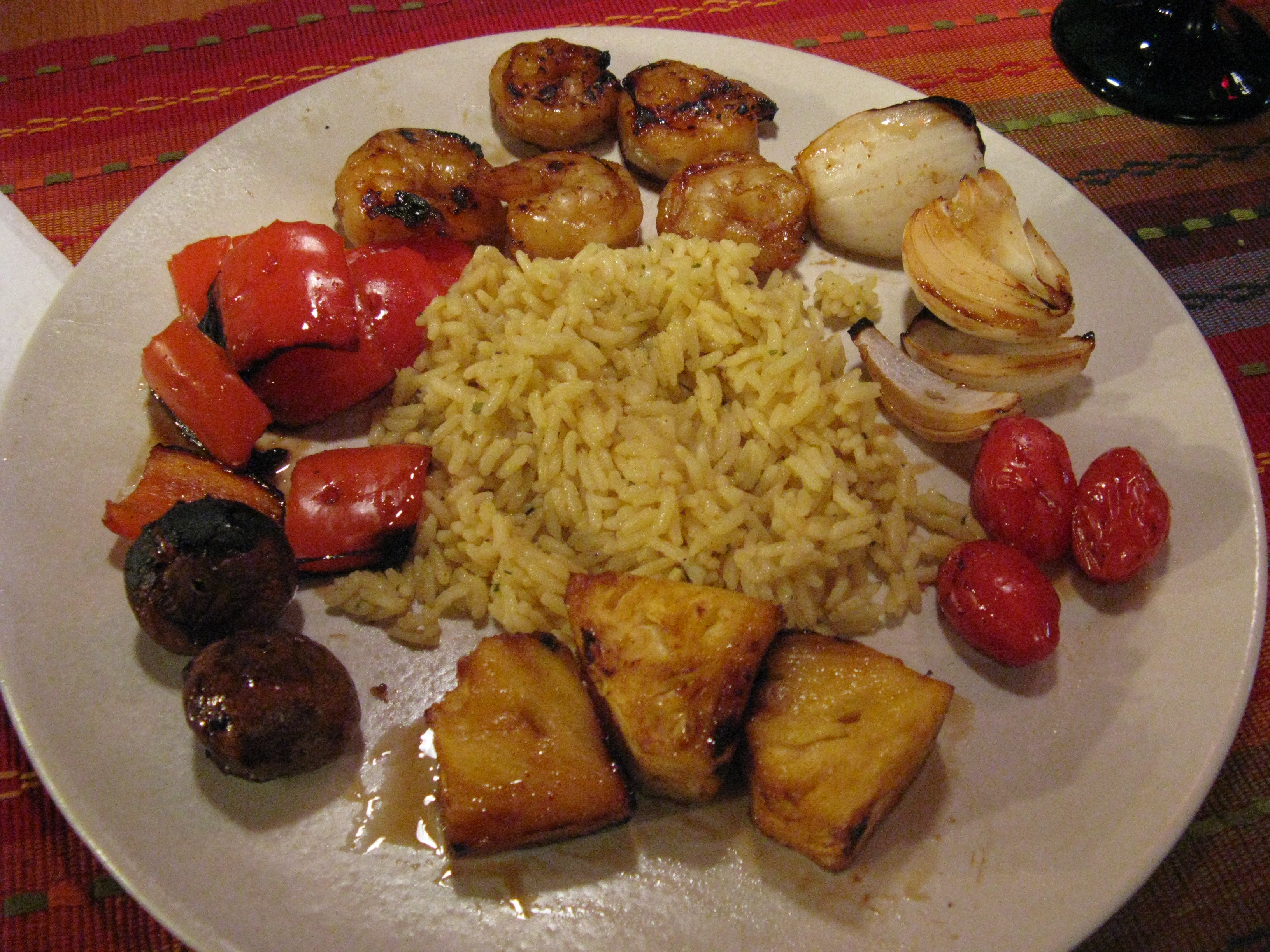 Aaaah, summertime, when grilling outside is de rigueur. One of my favorite meals to grill is kabobs because that way I can cook my meat (or in this case, shrimp) and veggies/fruit all at once.