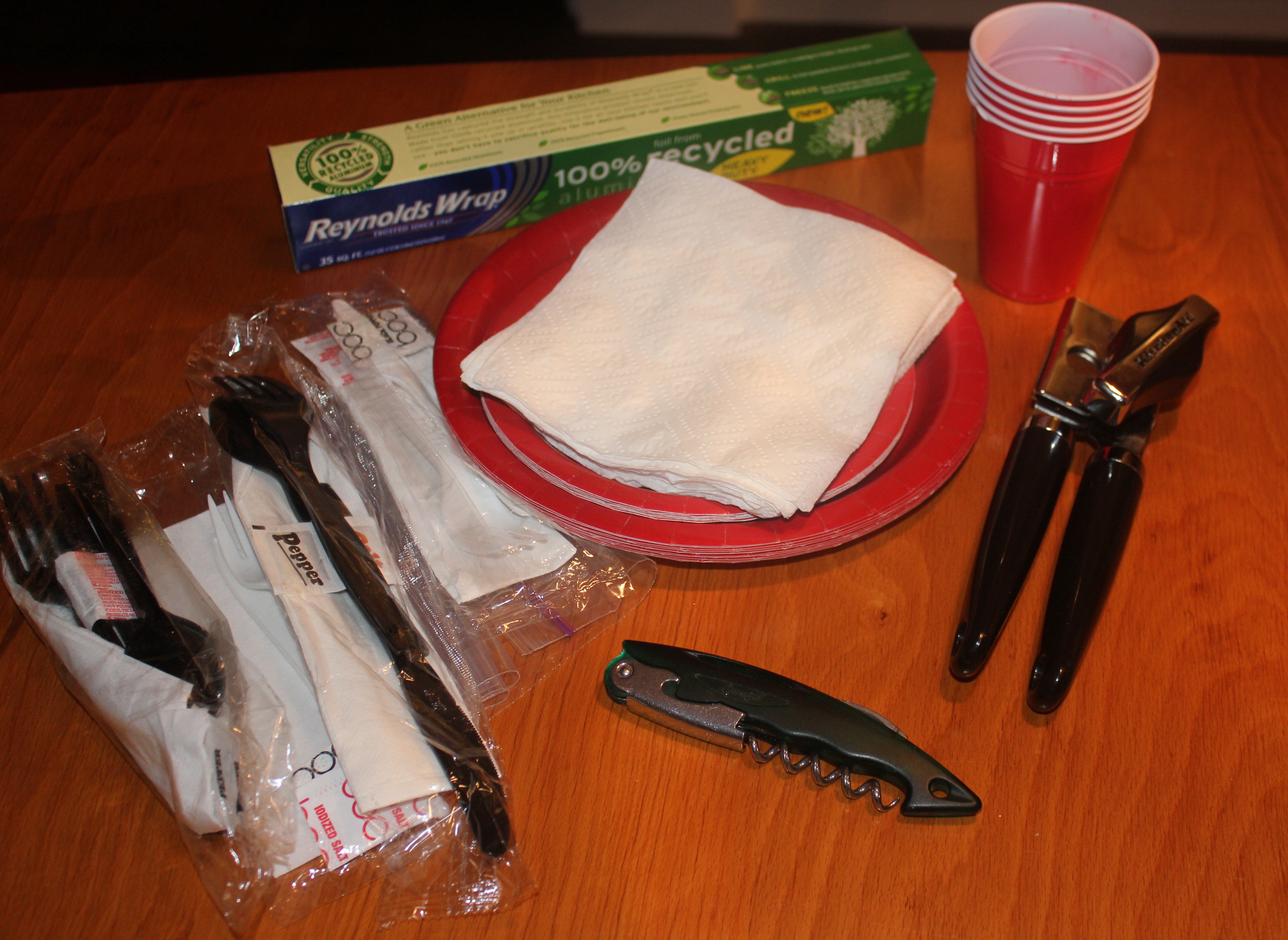 Include paper items such as napkins, plates, cups, utensils, aluminum foil, etc.