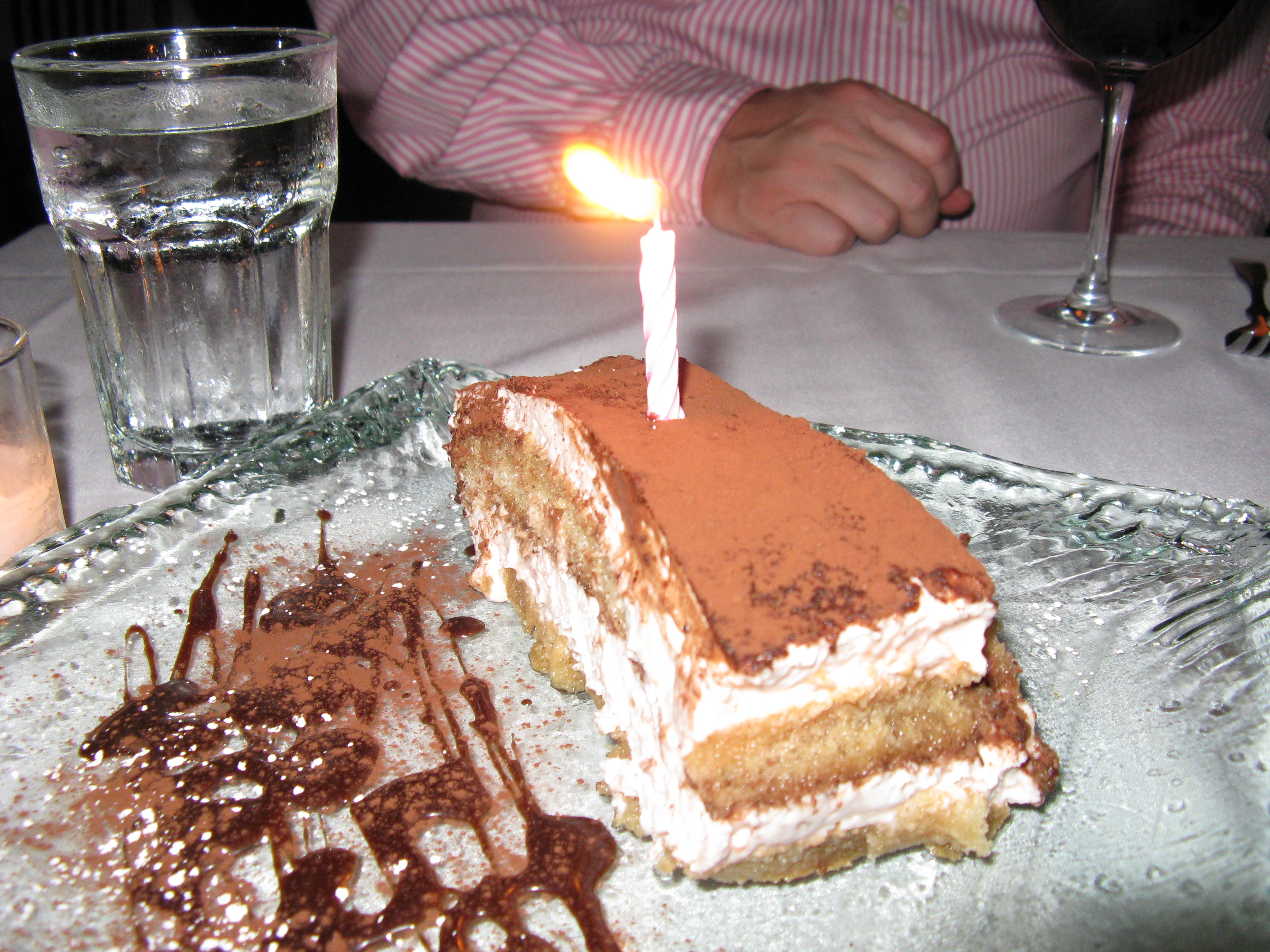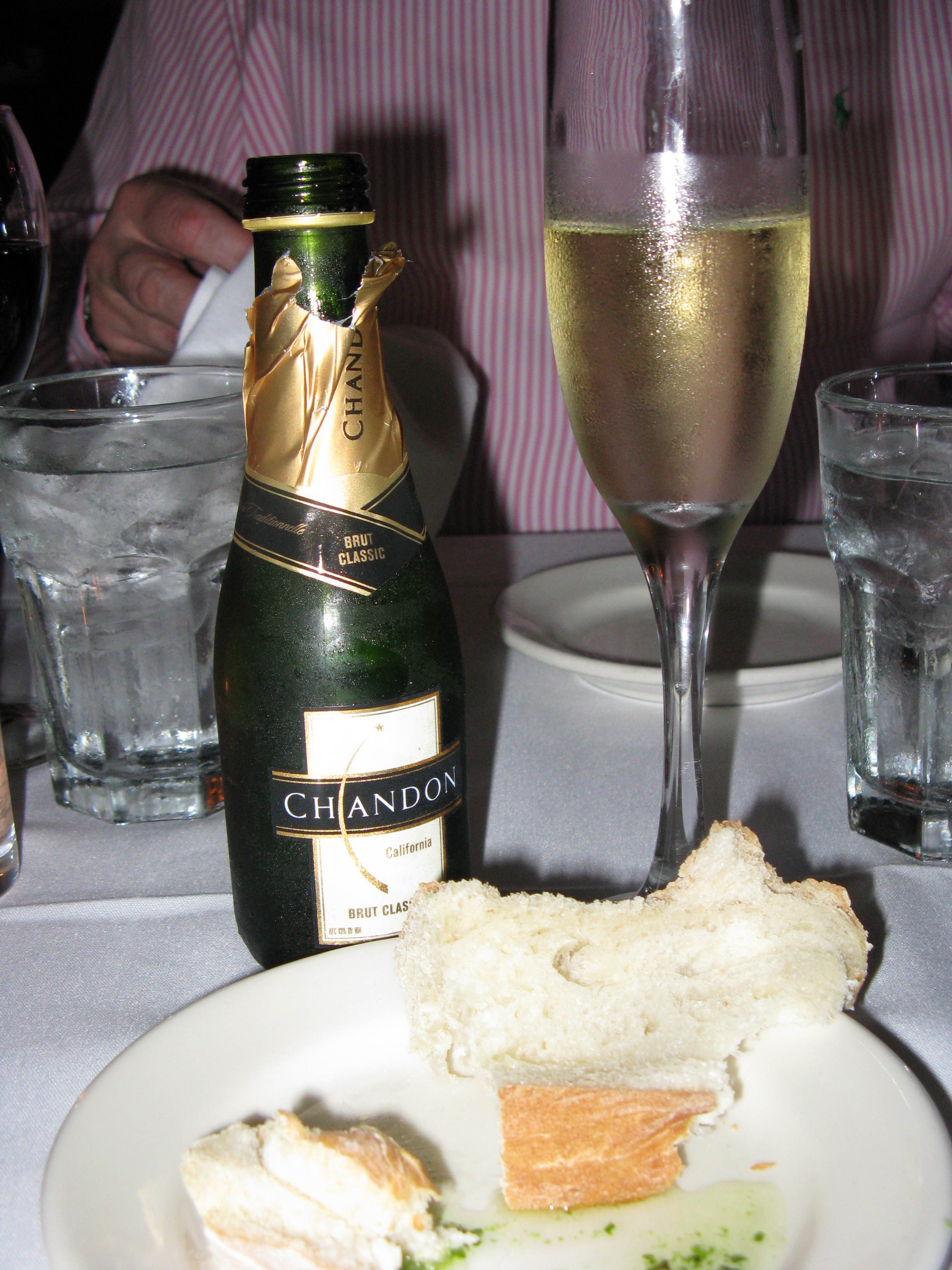 Brad and I recently celebrated my birthday at Café Tiramisu. I started off with a glass of bubbly (Domaine Chandon brut – $8.50 for a split. It is the only “champagne” offered by the glass. It sufficed.) Brad had a glass BV Cabernet ($8.50). Warm bread was immediately brought out to the table, with olive oil and herbs to dip it in. Yum!