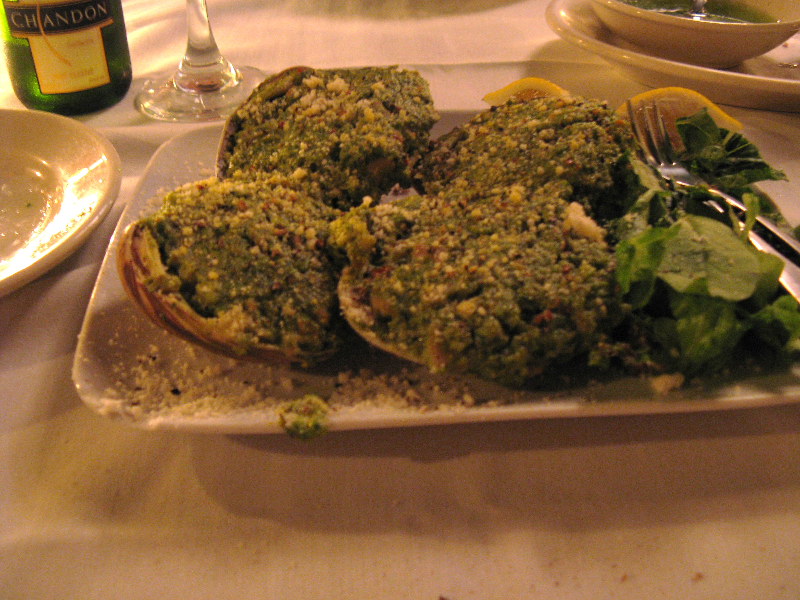 For an appetizer we ordered the stuffed clams (the photo below doesn’t do them justice.) These were wonderful! Stuffed with spinach, pancetta and seasoned breadcrumbs, they melted in your mouth. The clams were cooked perfectly – moist and not chewy at all ($8.00).