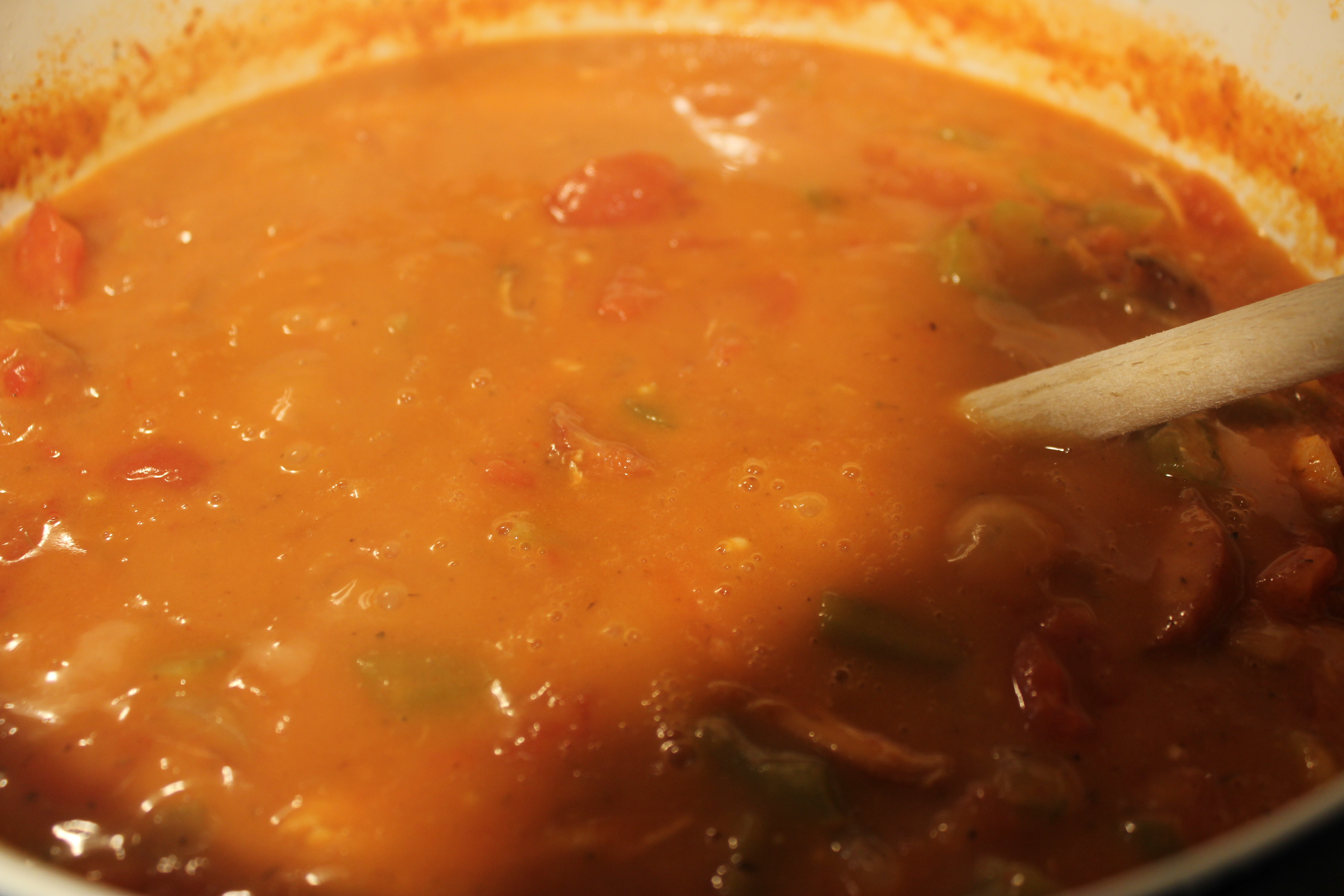 Add the sausage and cook for 5 minutes. Stir in the okra and the garlic until you can no longer see the white “threads” coming from the okra.