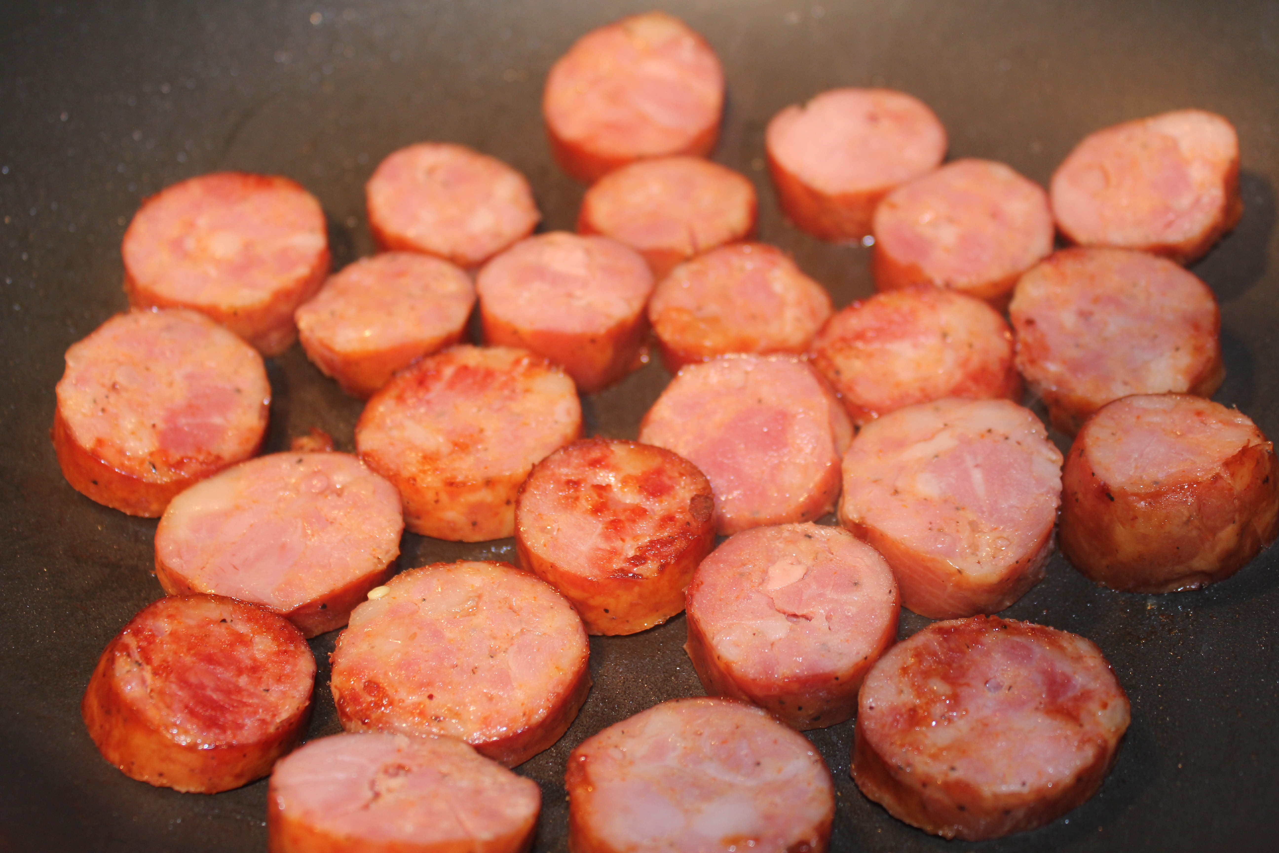 - ¾ lb. Andouille sausage, cut into ¼” rounds (I bought this
