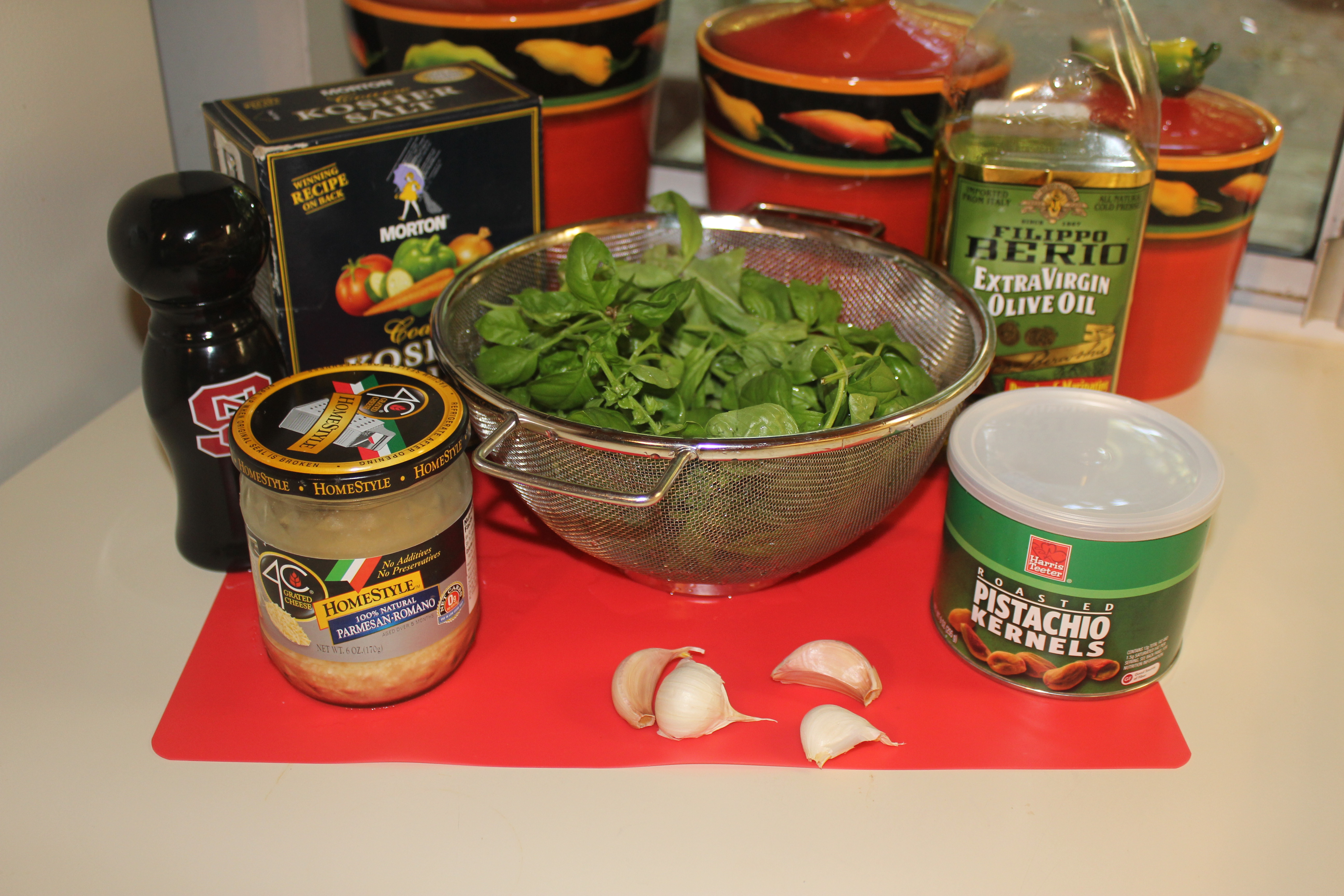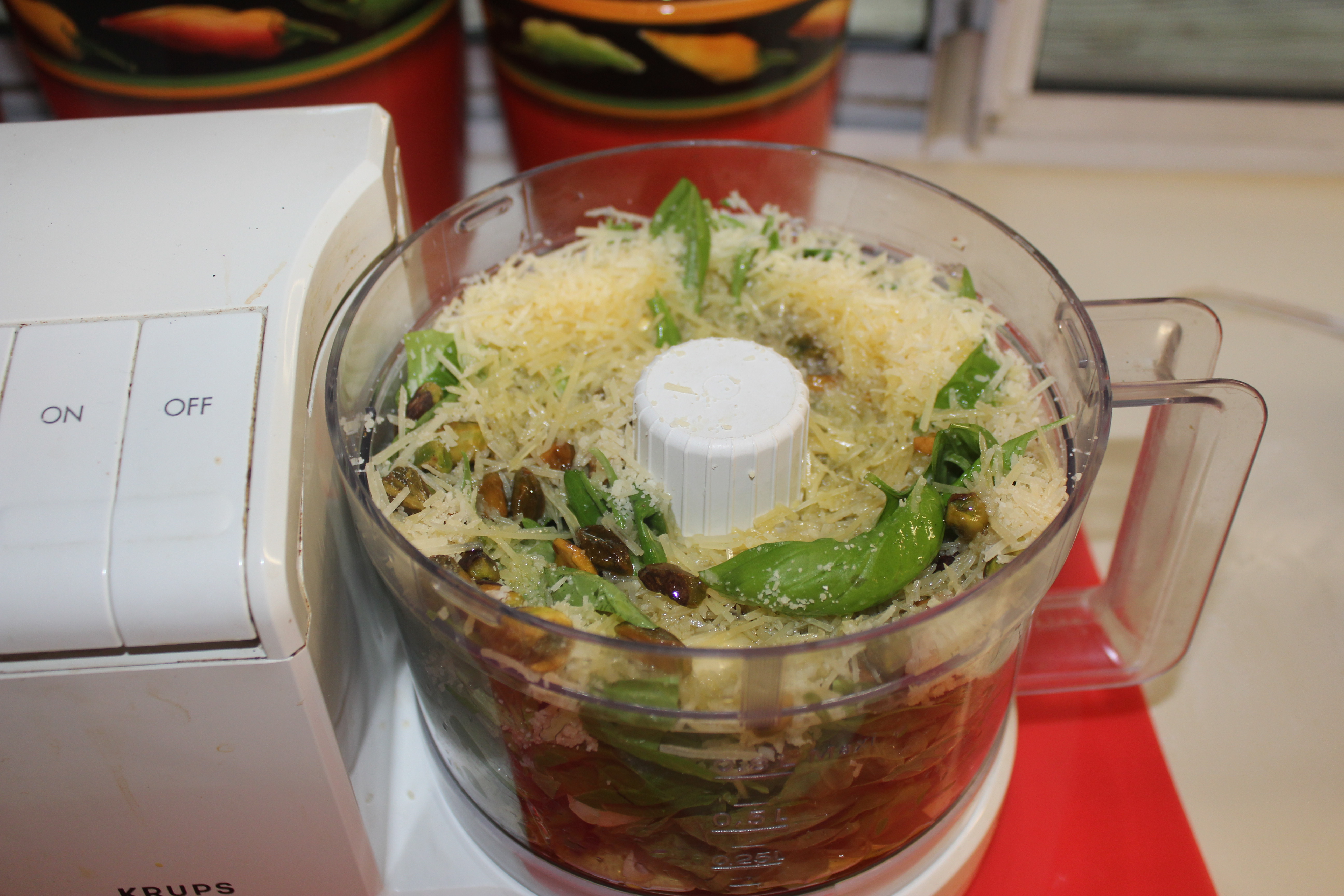 Place the basil leaves, garlic, cheese, olive oil and pistachio nuts in a food processor or blender.
