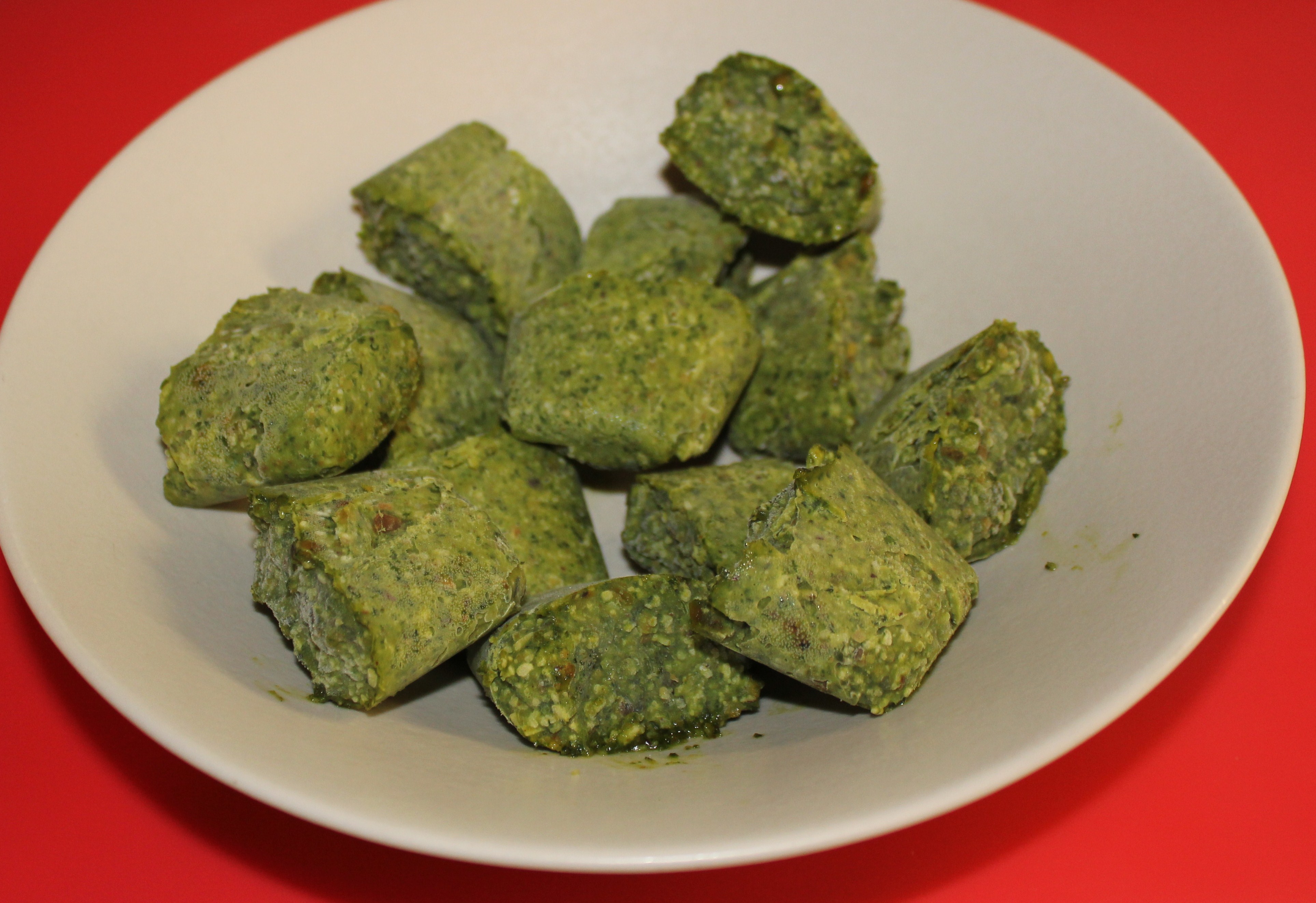 Pop the pesto “cubes” out of the tray (you may need to use a dinner knife to softly pry them out.)