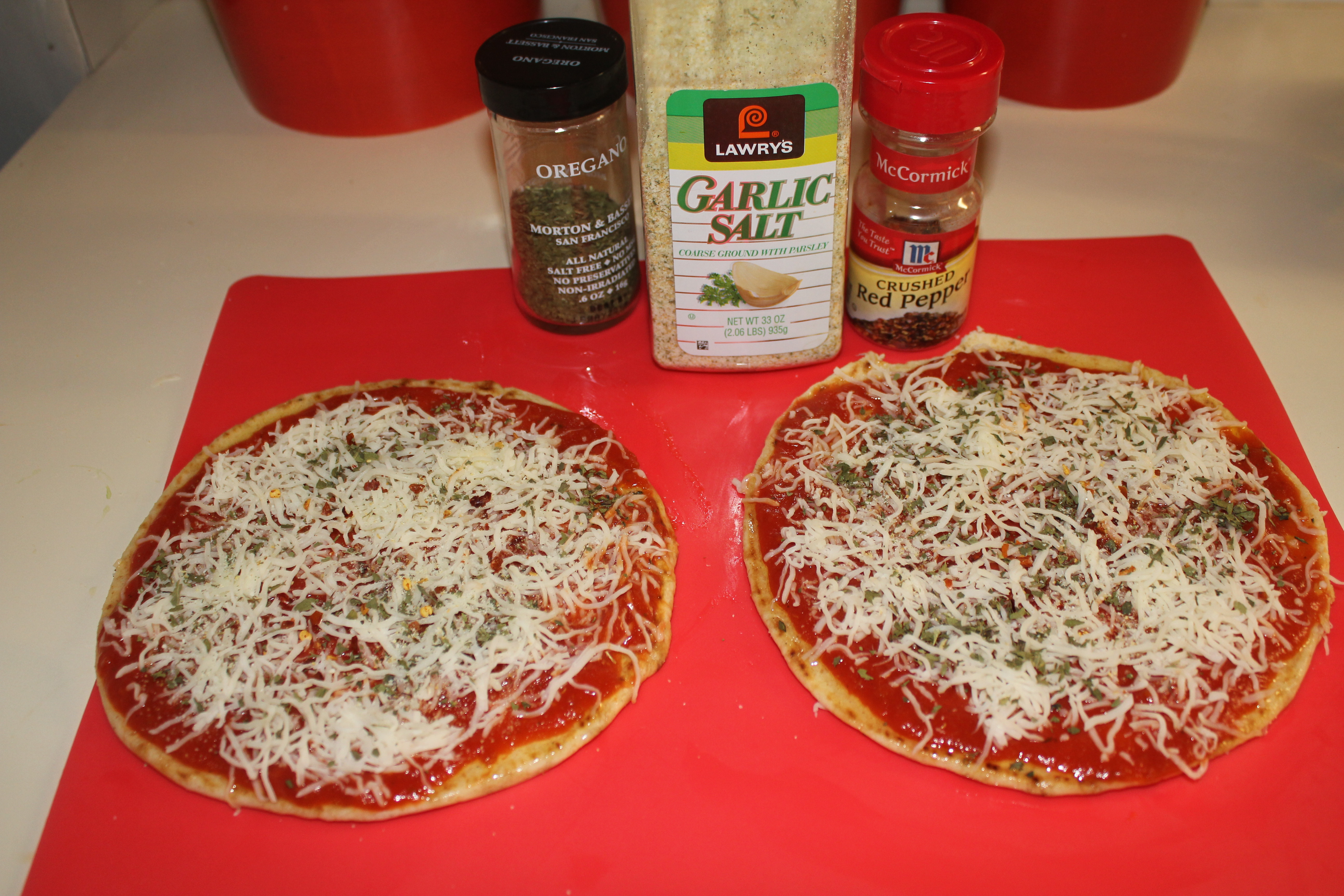 Evenly sprinkle ¼ cup (or more) of mozzarella on top of the sauce. Season with the oregano, garlic salt and crushed red pepper to taste.