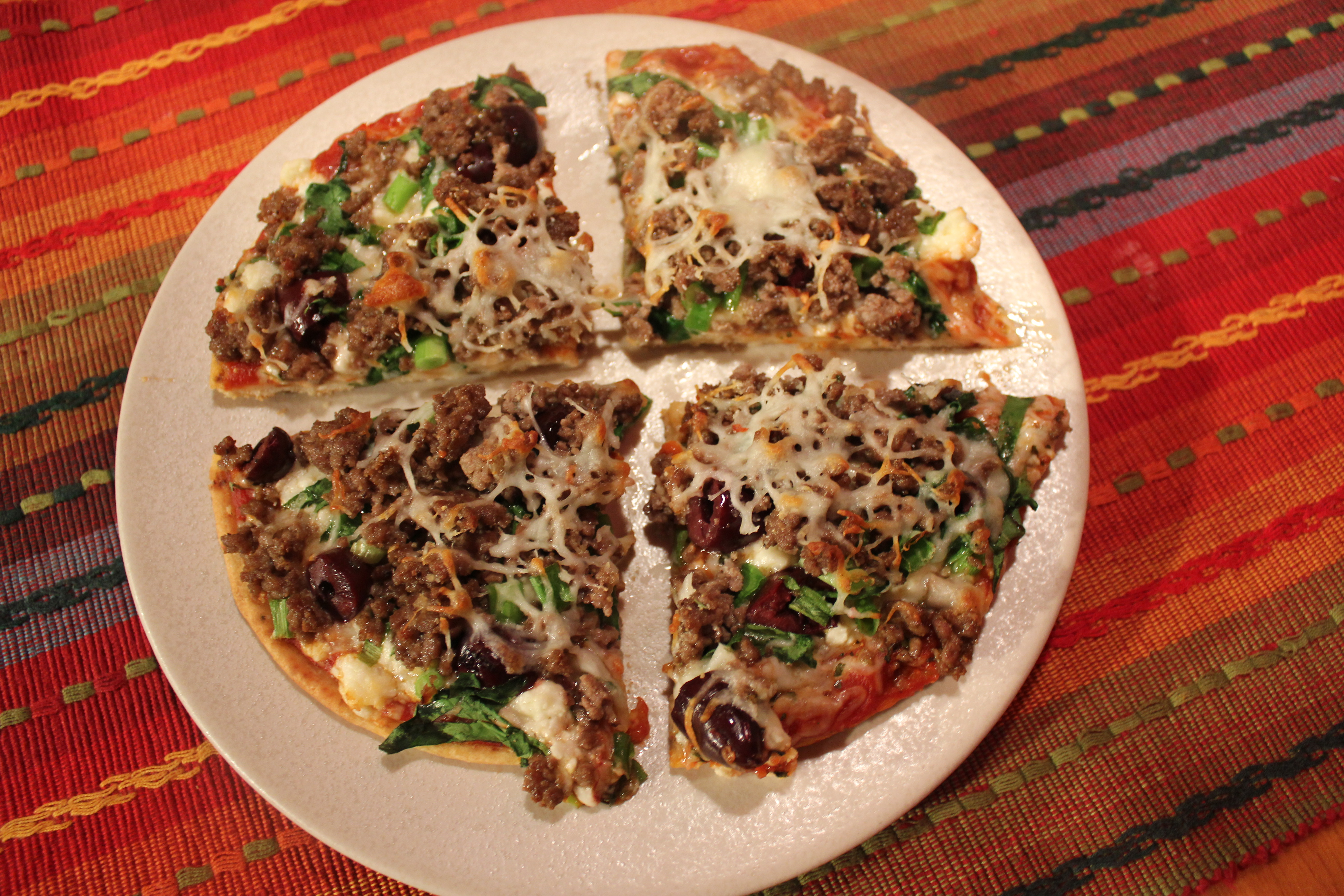 I started making pita pizzas years ago when I was single and lived alone. They are easy to make, and you can add whatever ingredients you happen to have on hand. I especially like these Greek-inspired lamb pita pizzas, with Kalamata olives, garlic, feta cheese and fresh baby spinach.