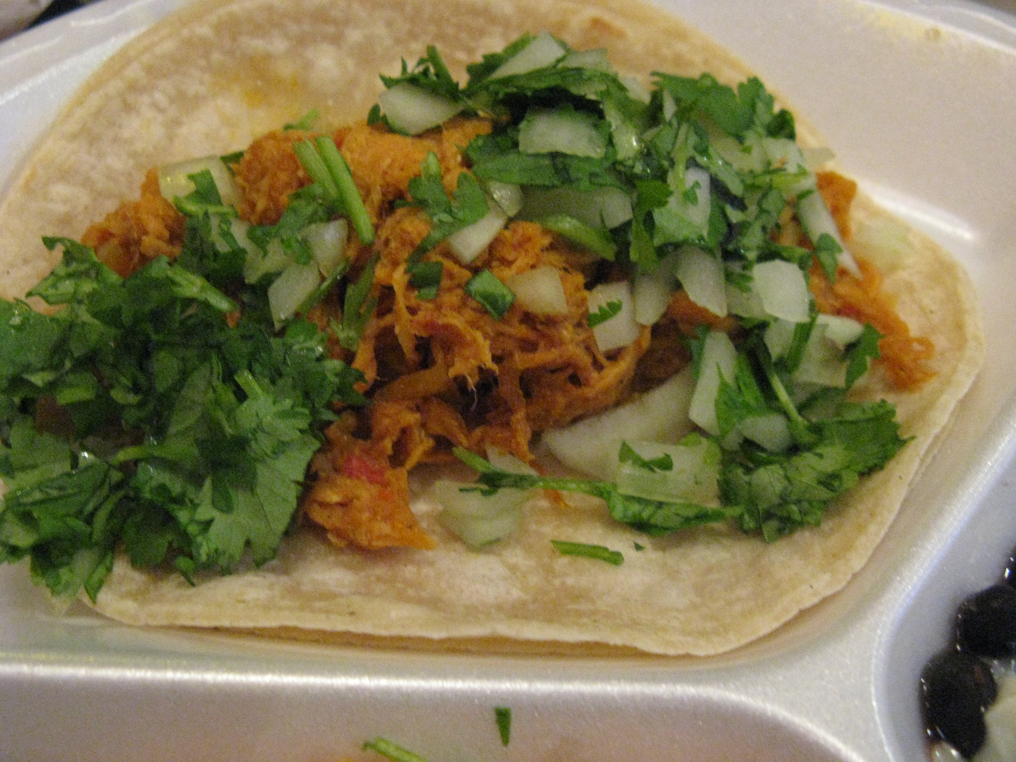 So far I’ve tried a couple of different $2.00 tacos and the house burrito ($5.00). I’ll start with the burrito – this thing weighed a ton. It is made with a fresh flour tortilla and comes with rice, refried beans, lettuce, cheese and a choice of one additional filling. I chose Barbacoa, with is Mexican BBQ beef with cilantro and onions. The beef was so tender and perfectly seasoned. I had just started eating when a friend of mine walked by my table and was in disbelief that I had ordered the burrito. “You will never finish that!” he said. He was right – I barely could eat half of it (the leftovers were so good the next day.) If you order this, bring your appetite, or be prepared to take some of it home.