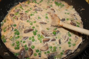 Add the sauce to the turkey and mushroom mixture and gently stir in the peas. Season to taste with fresh ground pepper, salt and paprika. Heat thoroughly.
