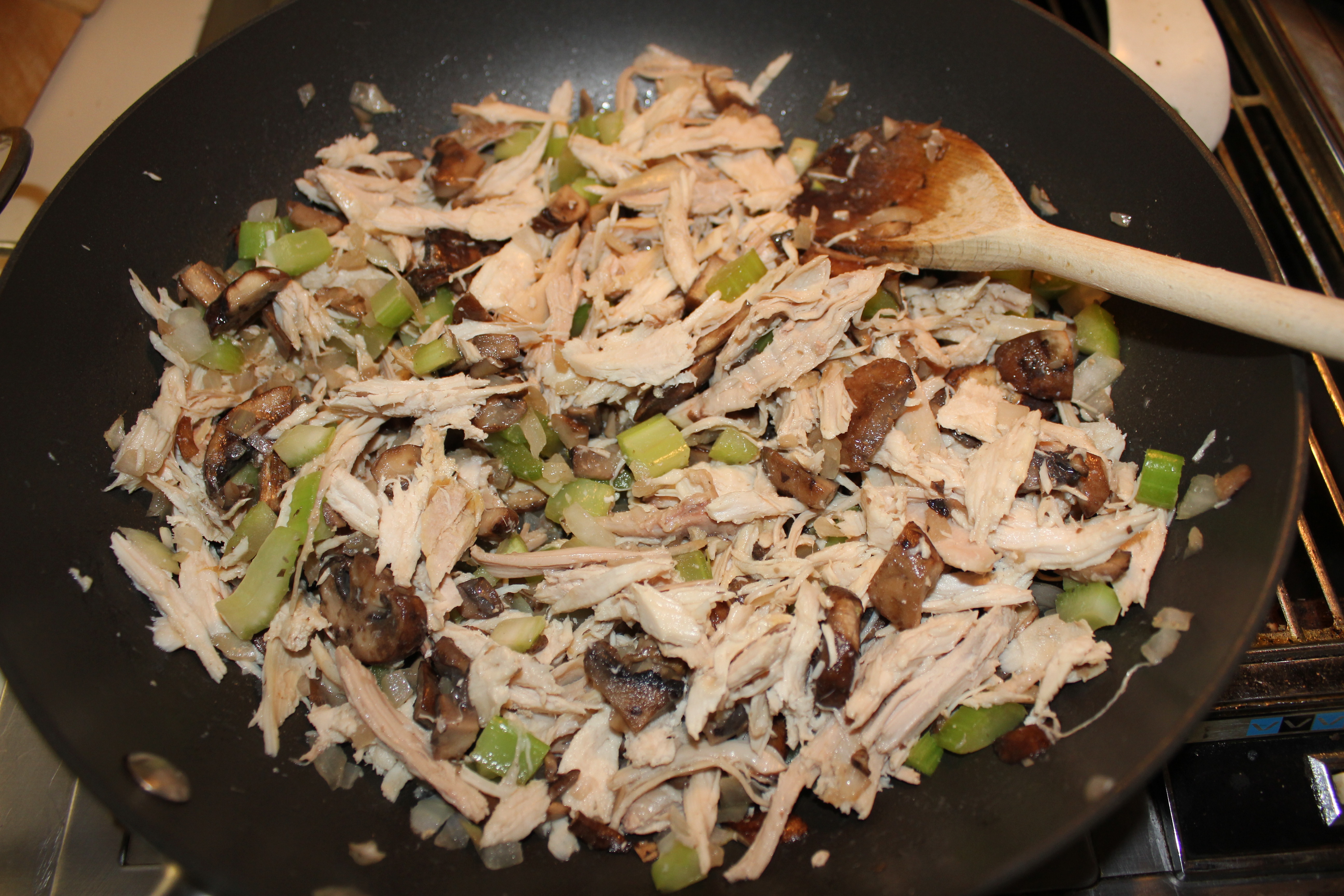 Stir in the turkey, mushrooms and sherry.