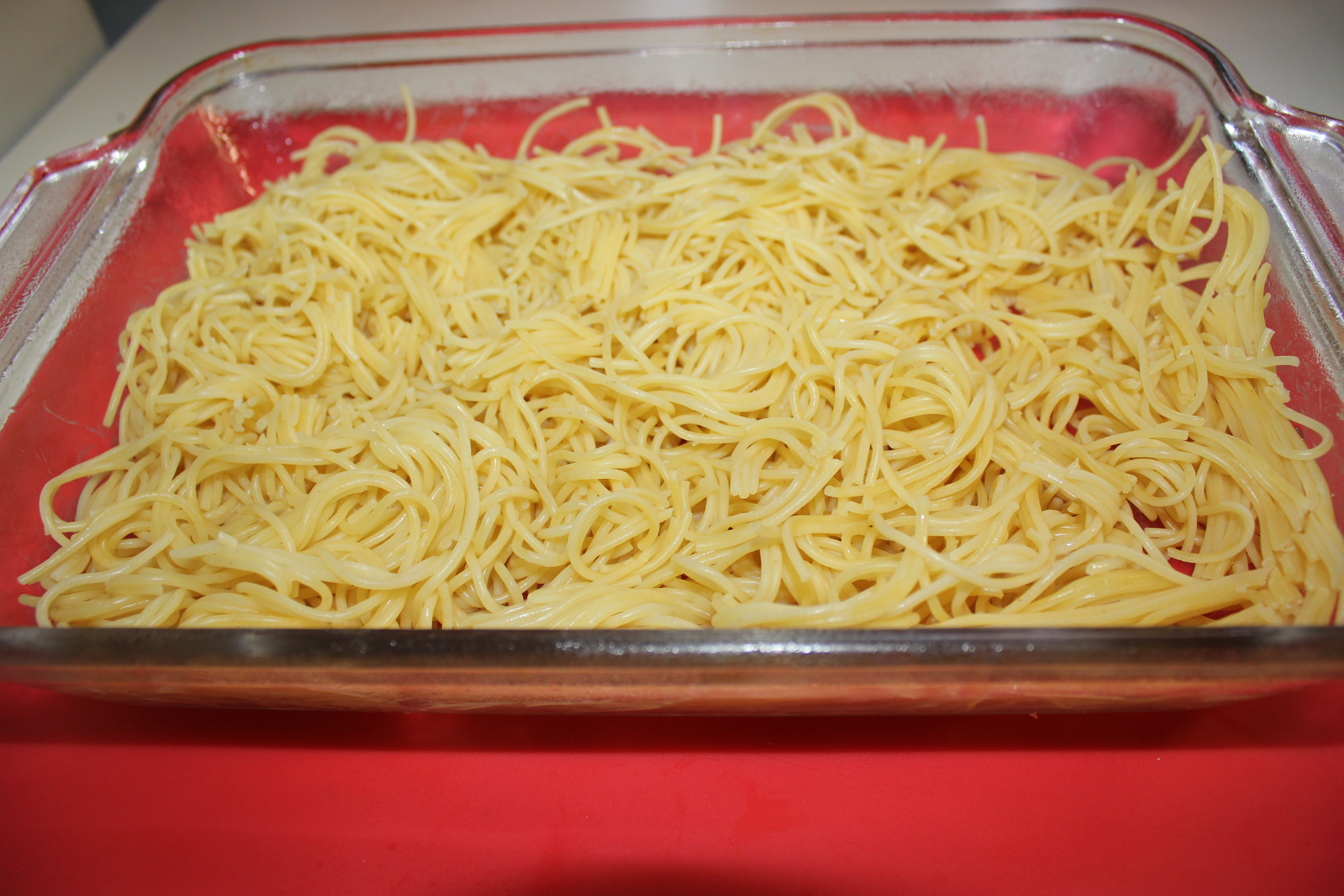 Cook spaghetti al dente, according to directions on package (about 6 or 7 minutes). Drain well, and place in a greased 13 x 9 inch casserole dish.