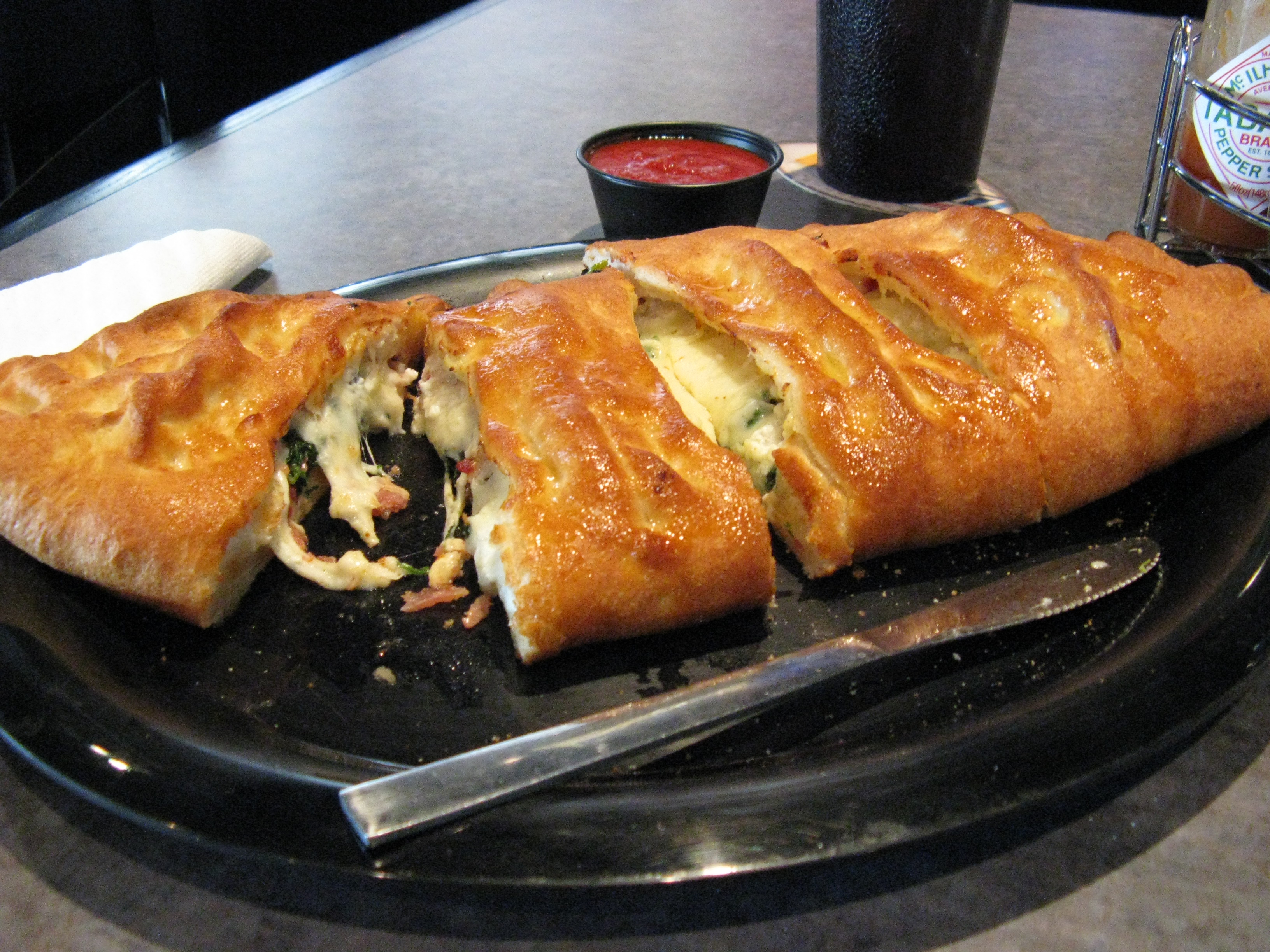 The calzones are also quite good and are fresh and huge – usually I only can finish half of one in a sitting. That’s okay – it is so easy to reheat and enjoy later. Each calzone starts with pizza sauce and ricotta cheese for $7.50. Additional toppings are $.60 each. I order mine with just spinach when I’m in vegetarian world, and spinach and bacon when I’m eating meat. Marinara sauce is served on the side for dipping. I love the crust of these calzones – golden brown, soft and a little bit chewy. Yum!