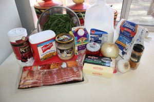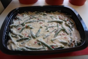 Grease a 9″ x 13″ casserole dish (I actually used a disposal cooking pan made by Glad, so did not bother to use any cooking spray, etc.) Place the green beans in the pan and add the bacon pieces.