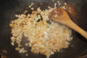 Fry the bacon in a skillet until it is crisp, place on paper towels to remove grease and crumble it once it has cooled. Use one tablespoon of the bacon grease to sauté the onions and garlic (3-4 minutes). Remove from heat.