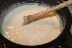 Instead of telling Nancy that there was no way in hell that I was going to make this and I’d bring something else, I decided to rise to the occasion and update this passé standby with something fresher, tastier and much more appealing. First and foremost, fresh green beans topped my ingredient list. Out with the cream of mushroom soup, in with a homemade white sauce with lots of sharp cheddar cheese. And the pièce de résistance: bacon, bacon and more bacon! I decided to keep the onion rings for old-time sake, but next time I make this I will probably use fresh breadcrumbs instead.