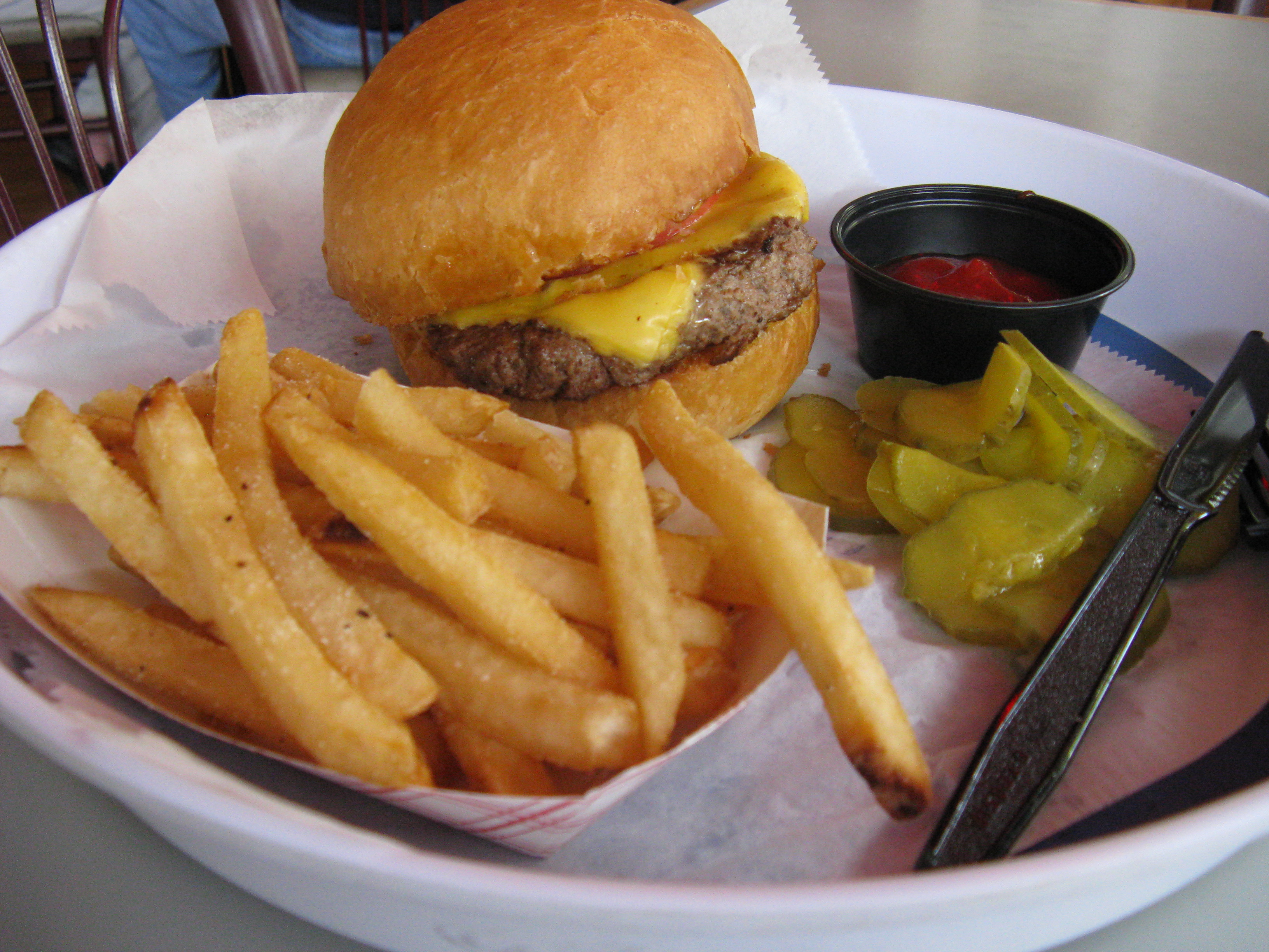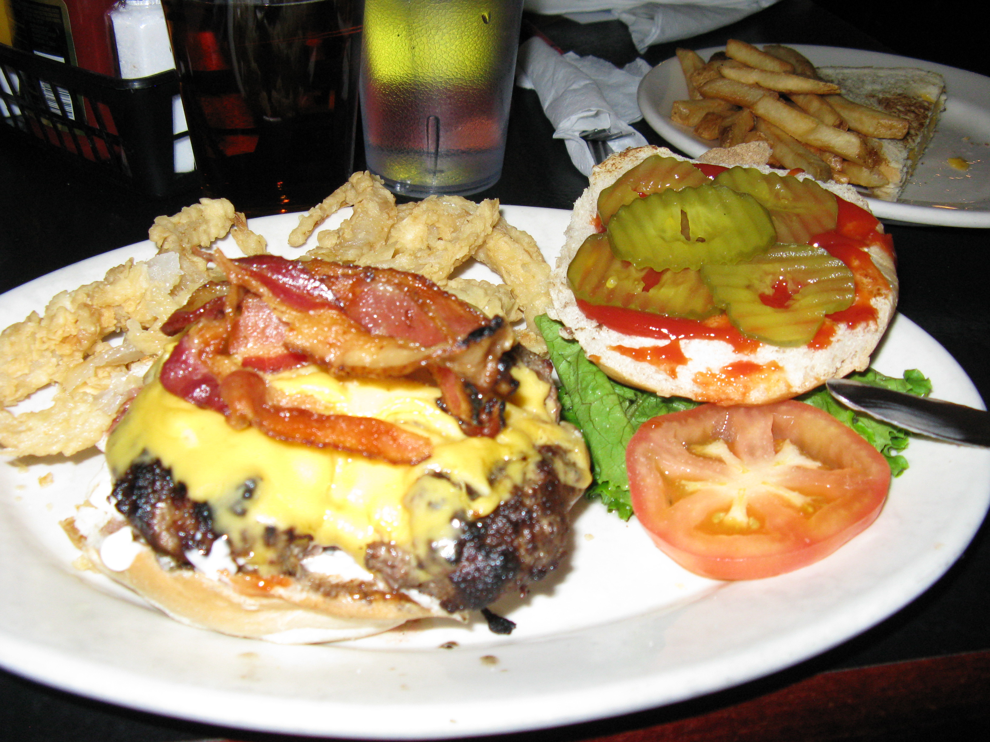 My burger ($7.95) was awesome – 8 oz. of perfectly cooked ground-in-house beef. I added cheddar cheese ($.50) and smoked bacon ($.95). Yum!