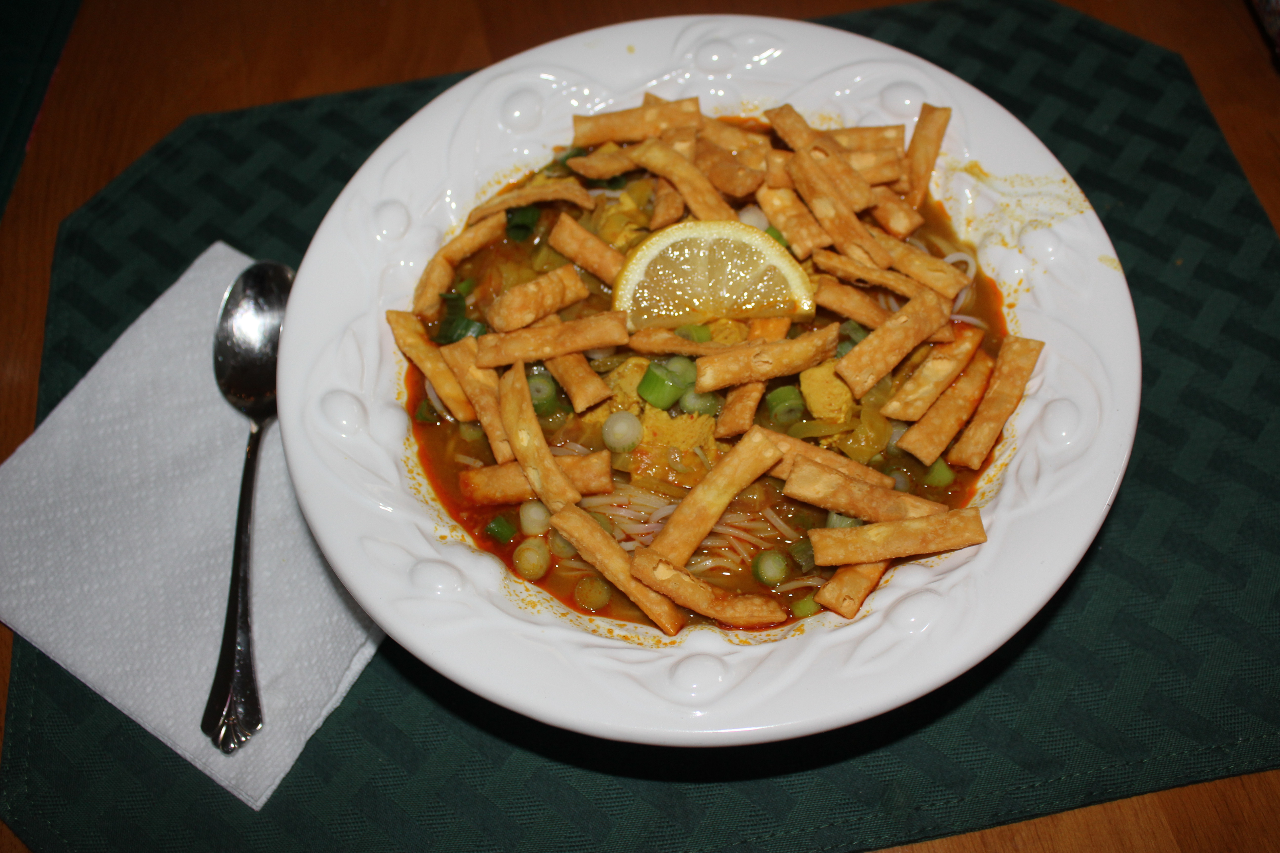 Garnish with green onions, fried noodles, a lemon slice and cracked pepper.