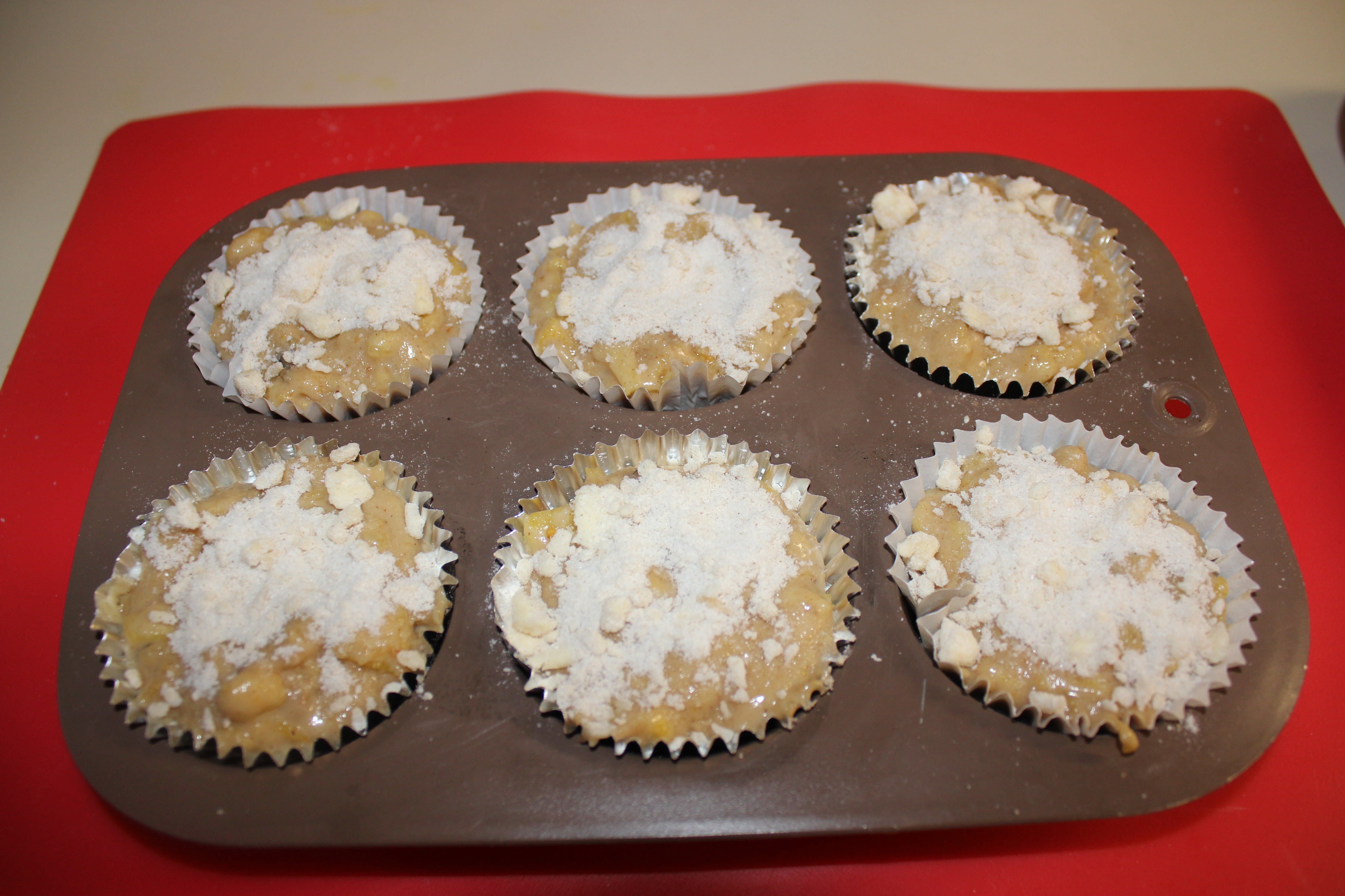 Cover each of the muffins with the streusel topping. Bake for 25-30 minutes, until a toothpick inserted in the middle of a muffin comes out clean. Let cool for 10 minutes or so and remove the muffins from the pan.