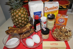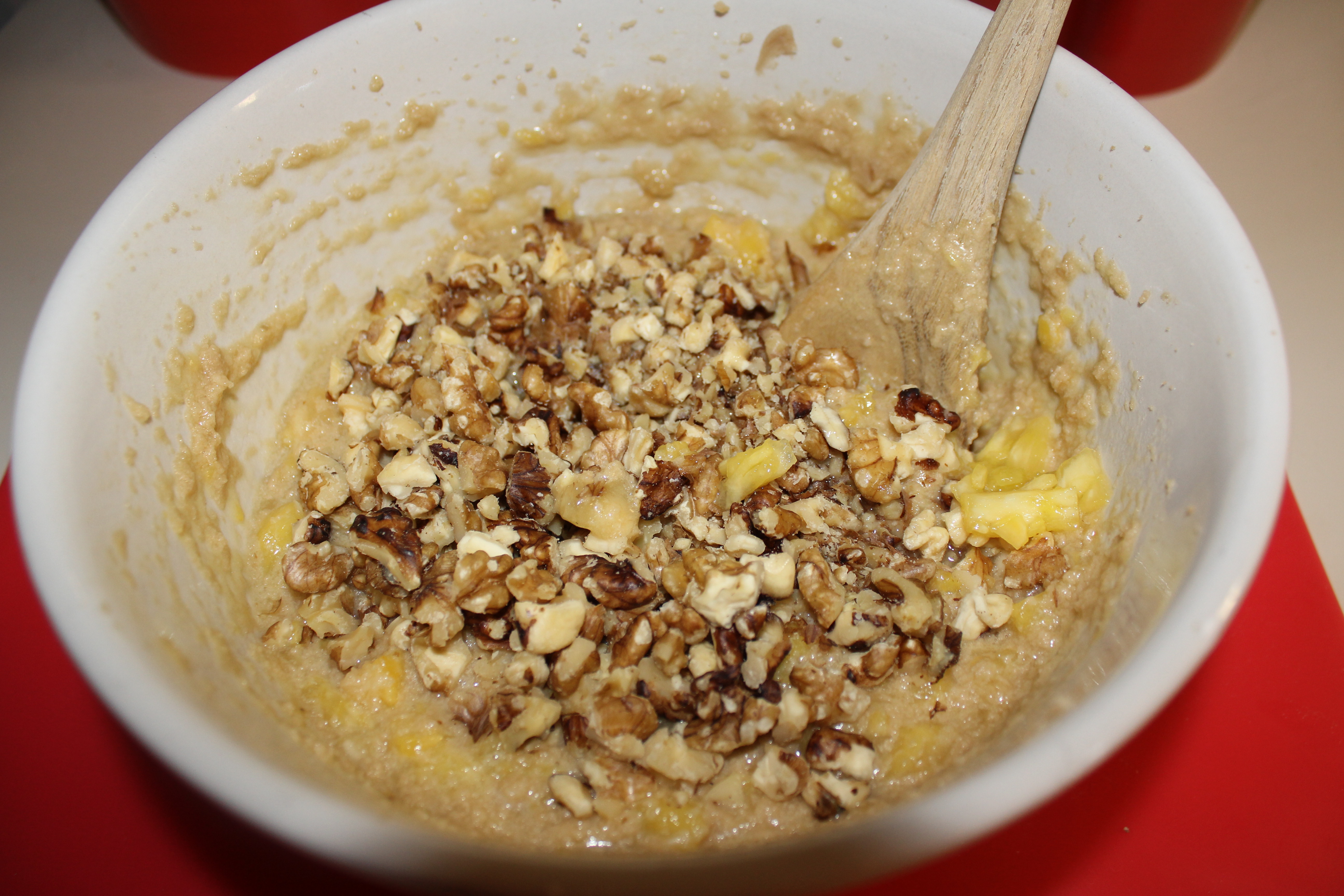 Add the banana pineapple mixture to the flour mixture, mix well and fold in the walnuts.