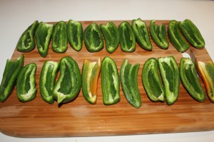 Slice the jalapeños lengthwise and remove the seeds and membranes. You should wear latex gloves for this step so you don’t get any of the oils from the jalapeños on your skin or, worse yet, in your eyes. Trust me on this one – getting jalapeño oil in your eyes hurts like hell.