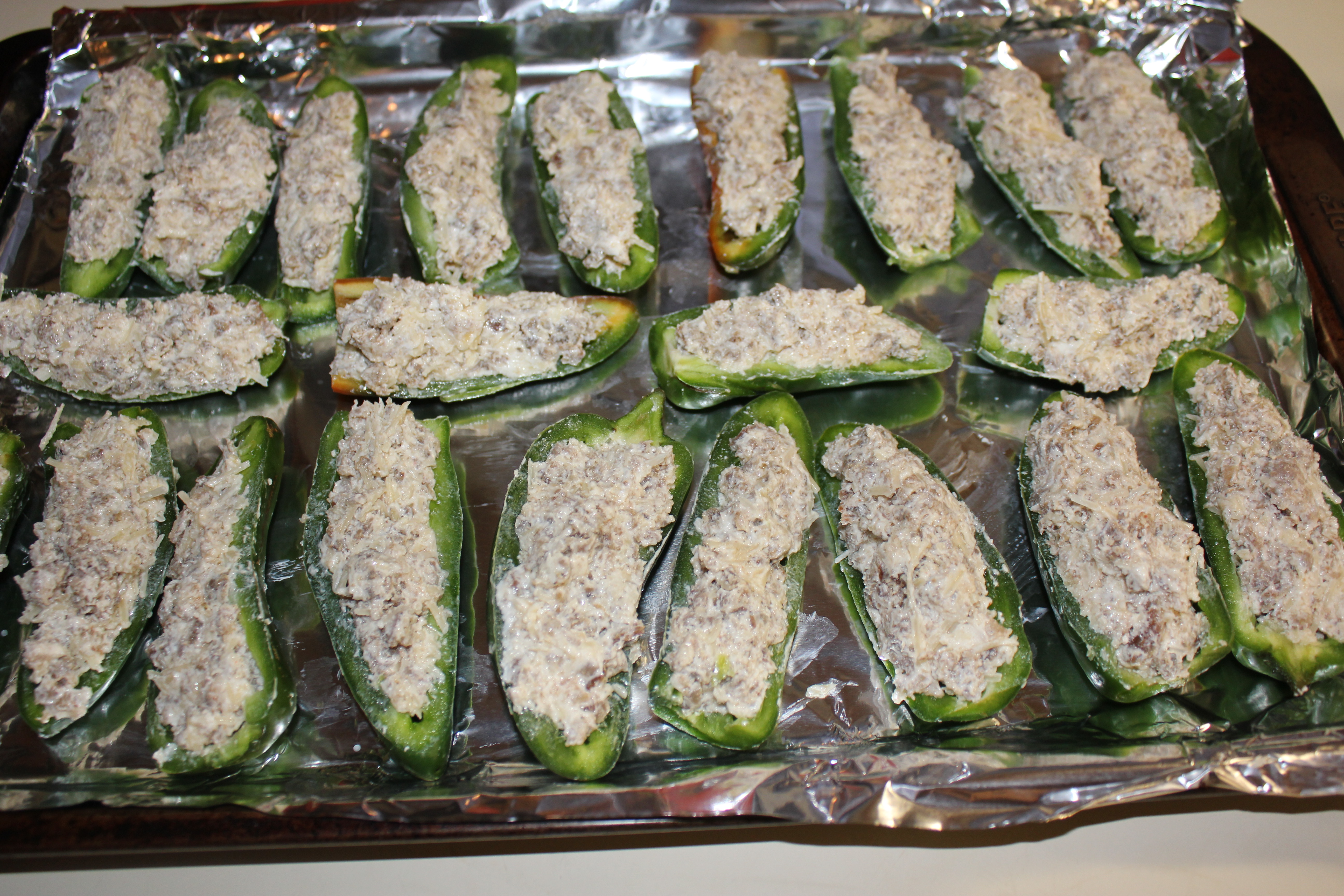 Fill each jalapeño half with the sausage mixture, and place on a large baking sheet lined with aluminum foil for easy cleanup.