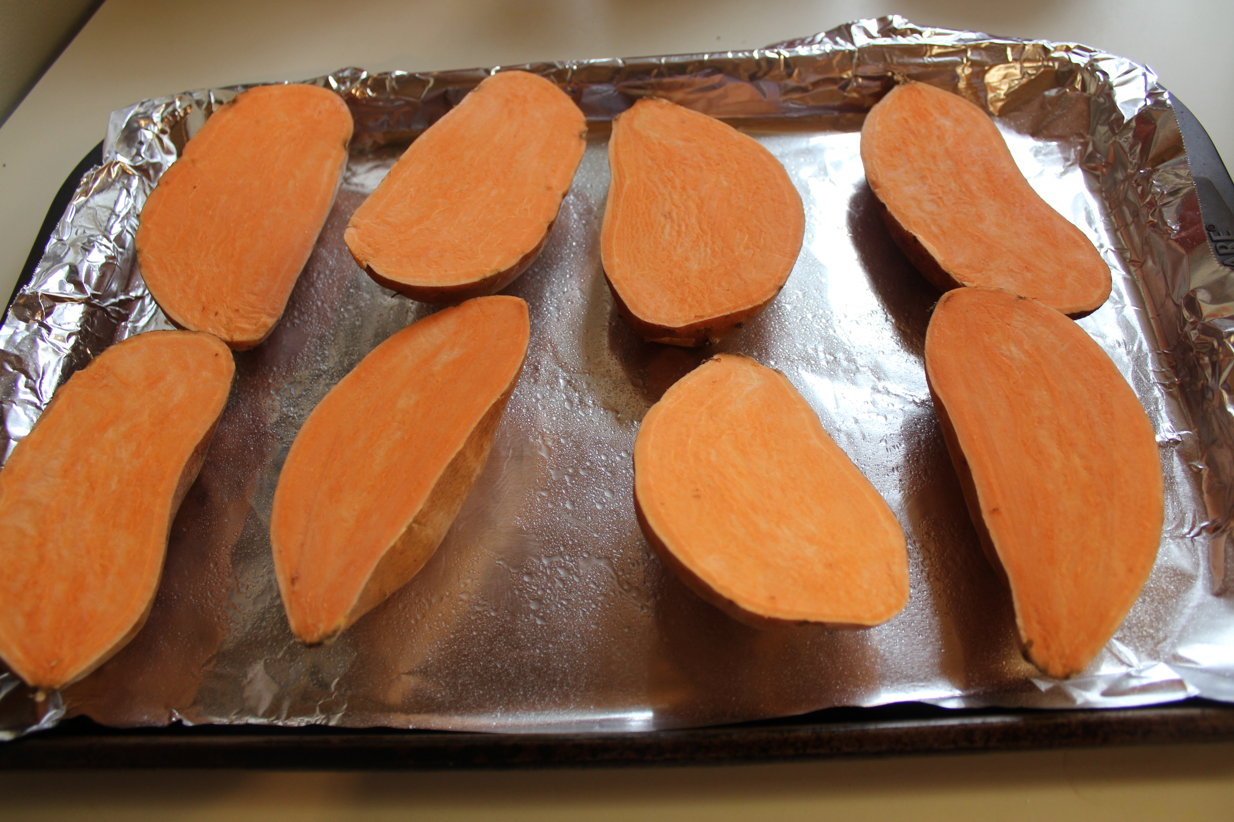 Cut the sweet potatoes in half lengthwise. Place on a baking sheet (I line mine with foil for easy cleanup) cut side up, and bake for 20 minutes. Flip the potatoes and cook for another 15 to 20 minutes, but keep an eye on them – you don’t want the insides to be too mushy. Remove the potatoes from the oven and let cool.