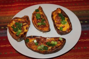 Potato skins are one of my go-to bar foods, but I must say that these homemade sweet potato skins are some of the best I have ever had, period. Once you try these, you may never want skins made from regular potatoes again. Wow – these are absolutely fabulous and so easy to prepare! Plus, sweet potatoes are good for you and are a wonderful source of beta-carotene, vitamin A, vitamin B6, vitamin C, vitamin E, fiber, thiamine, niacin, potassium, copper protein and calcium. If you are serving these at a party, say for the upcoming Super Bowl, you may want to make extra because they are going to go fast.