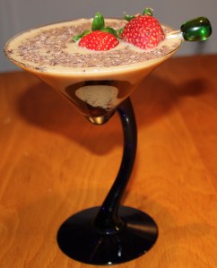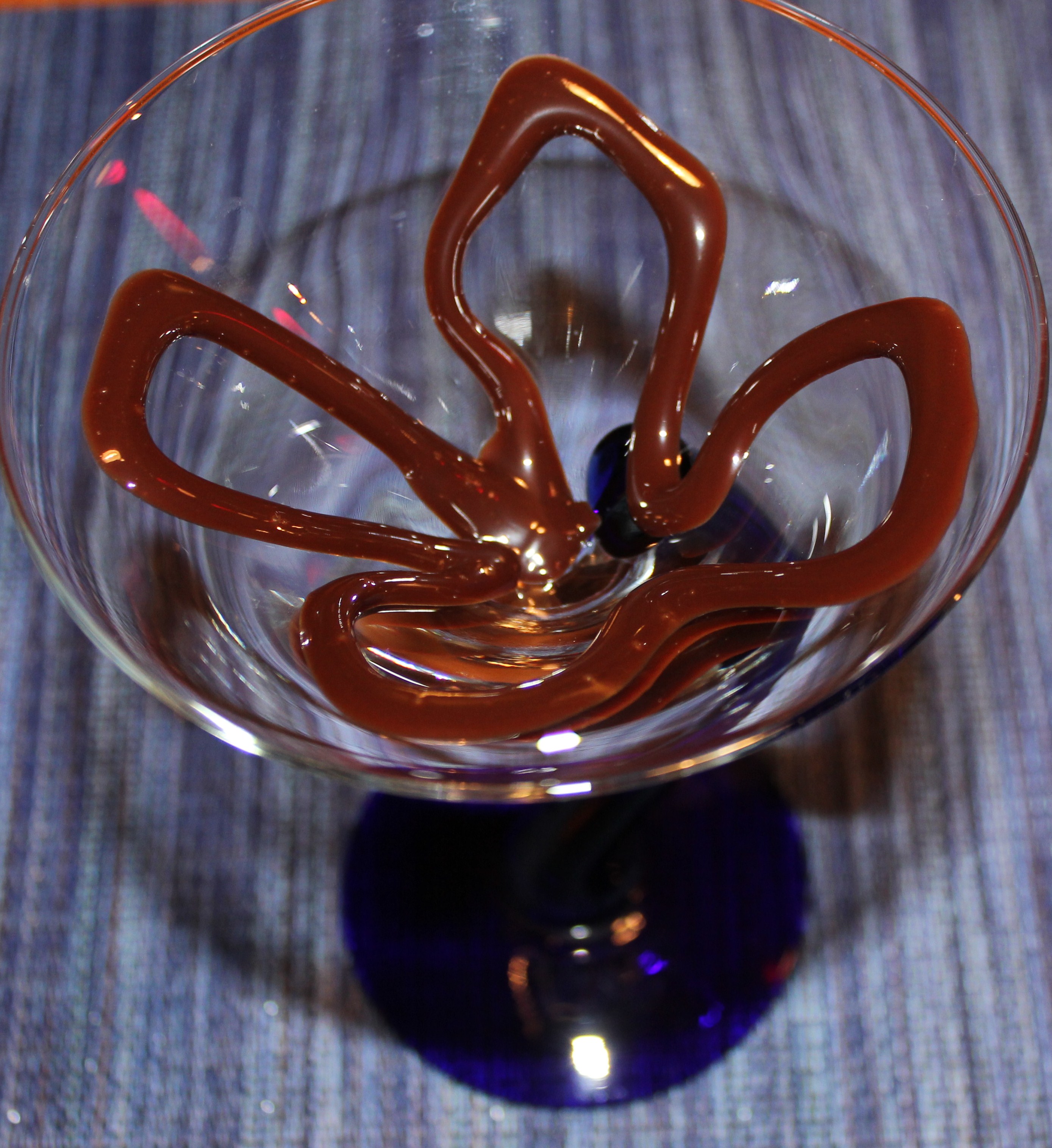 Chill the martini glasses. Take the chocolate syrup and make a fun pattern on the inside of each glass.