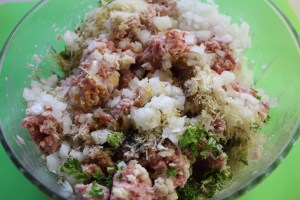 Add the onion, garlic, cheese, parsley, worstershire sauce and one of the eggs, and gently mix together well (it’s easiest to do this with clean hands instead of trying to use a spoon.) You want the mixture to be nice and moist – if it isn’t, go ahead and add the other egg.