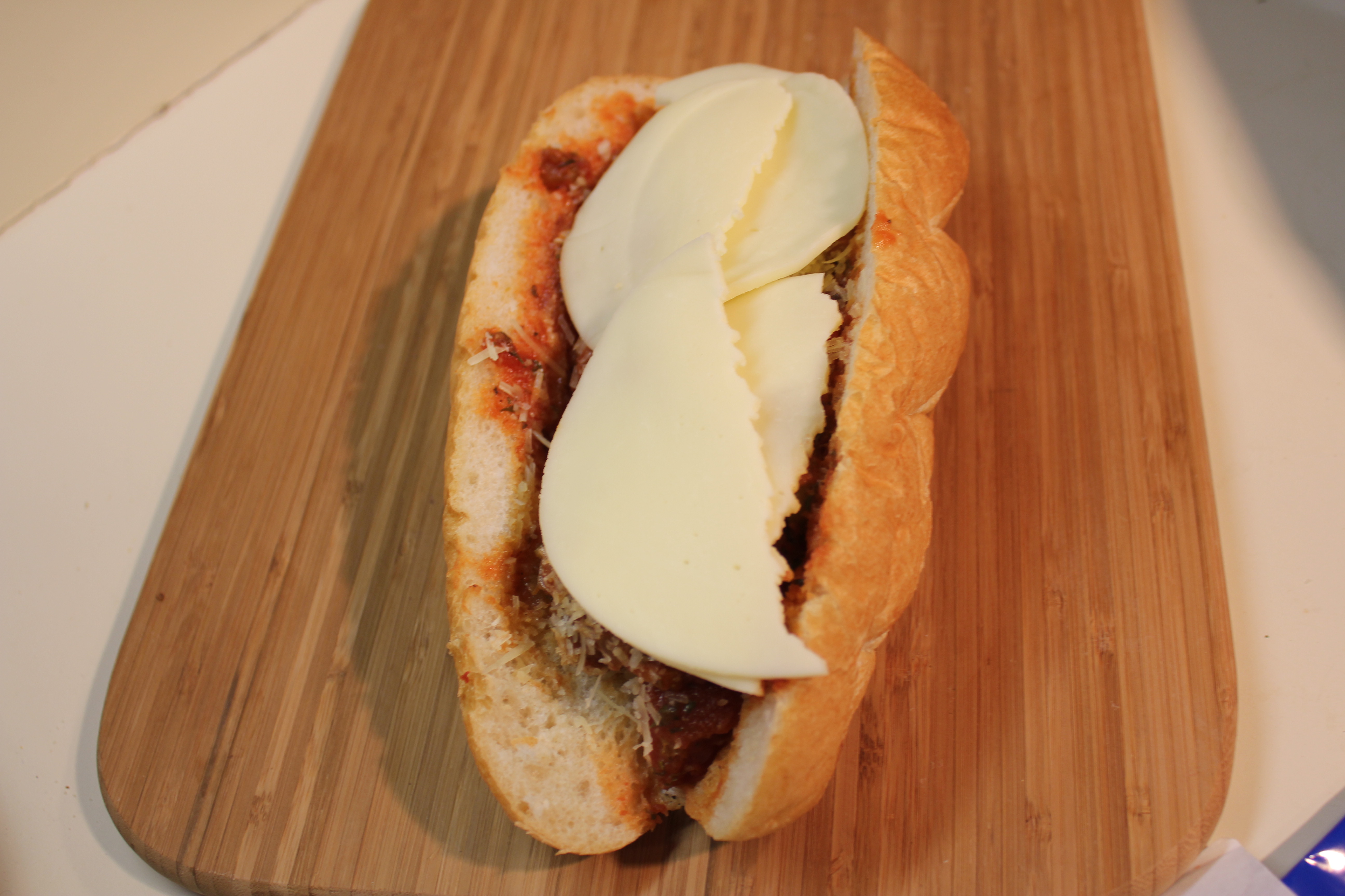 If you are using leftover meatballs and sauce that has been in the refrigerator for a day or say, go ahead and warm 4-5 meatballs and a good helping of sauce per sub.