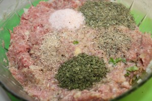Grate some of the fresh nutmeg with a micro plane (I do about 12-15 swipes) onto the meat mixture. Add the Italian seasoning, oregano, sea salt and ground pepper, and again gently mix. I refrigerate this for an hour or more so the meatballs will hold up better.
