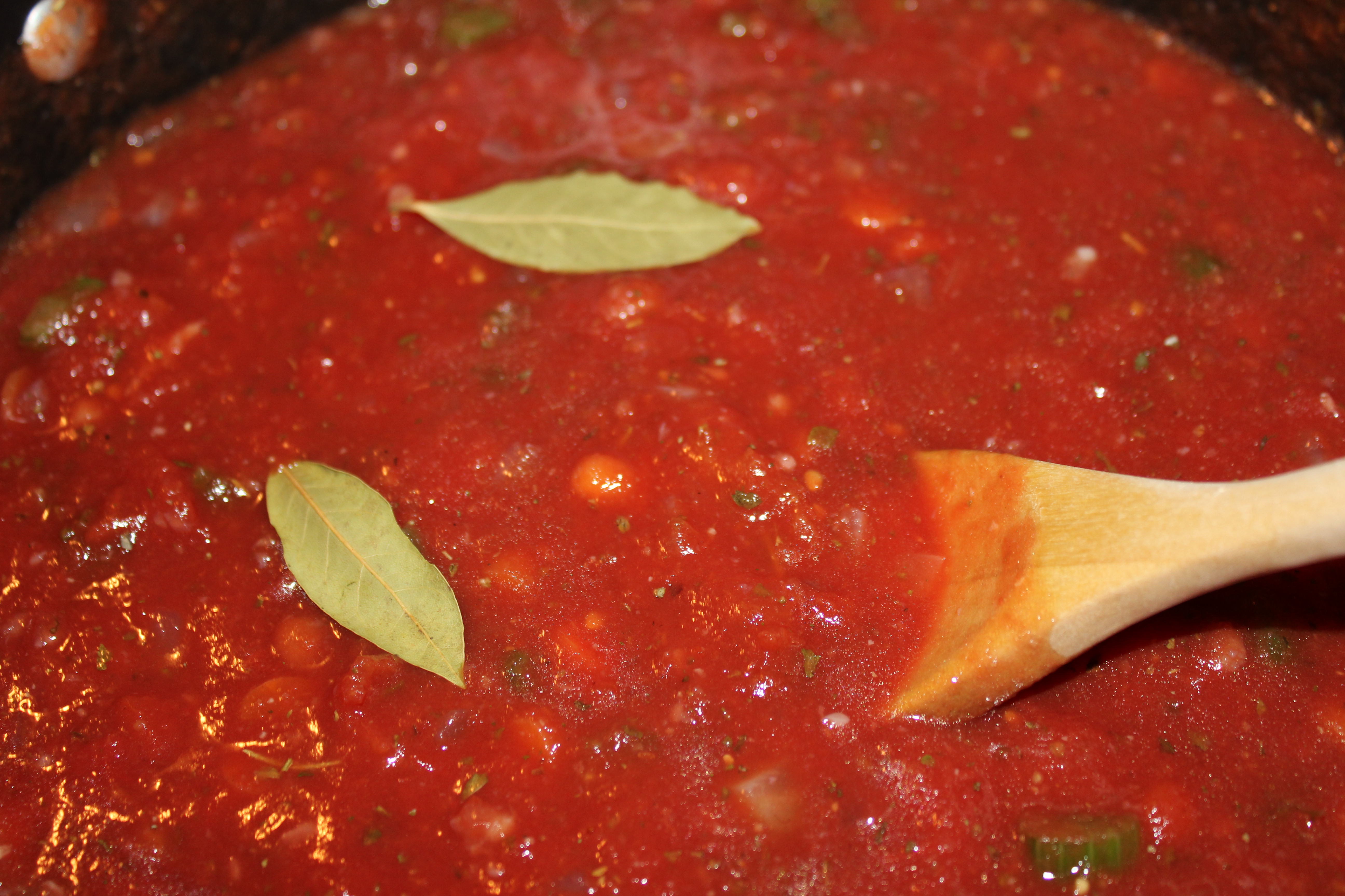 Mix in the sautéed veggies. Add the sugar and the bay leaves. Oh-oh, I just realized that I forgot to include these in the ingredients photo – blame it on the wine. Oh well, you know what they look like, and if not, here’s a picture.