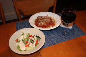 About 20 to 30 minutes before you’re ready to eat, add the meatballs and simmer on low. Refill your wine glass if you haven’t already done so. Serve over spaghetti noodles with a nice salad and/or a good, crusty bread.