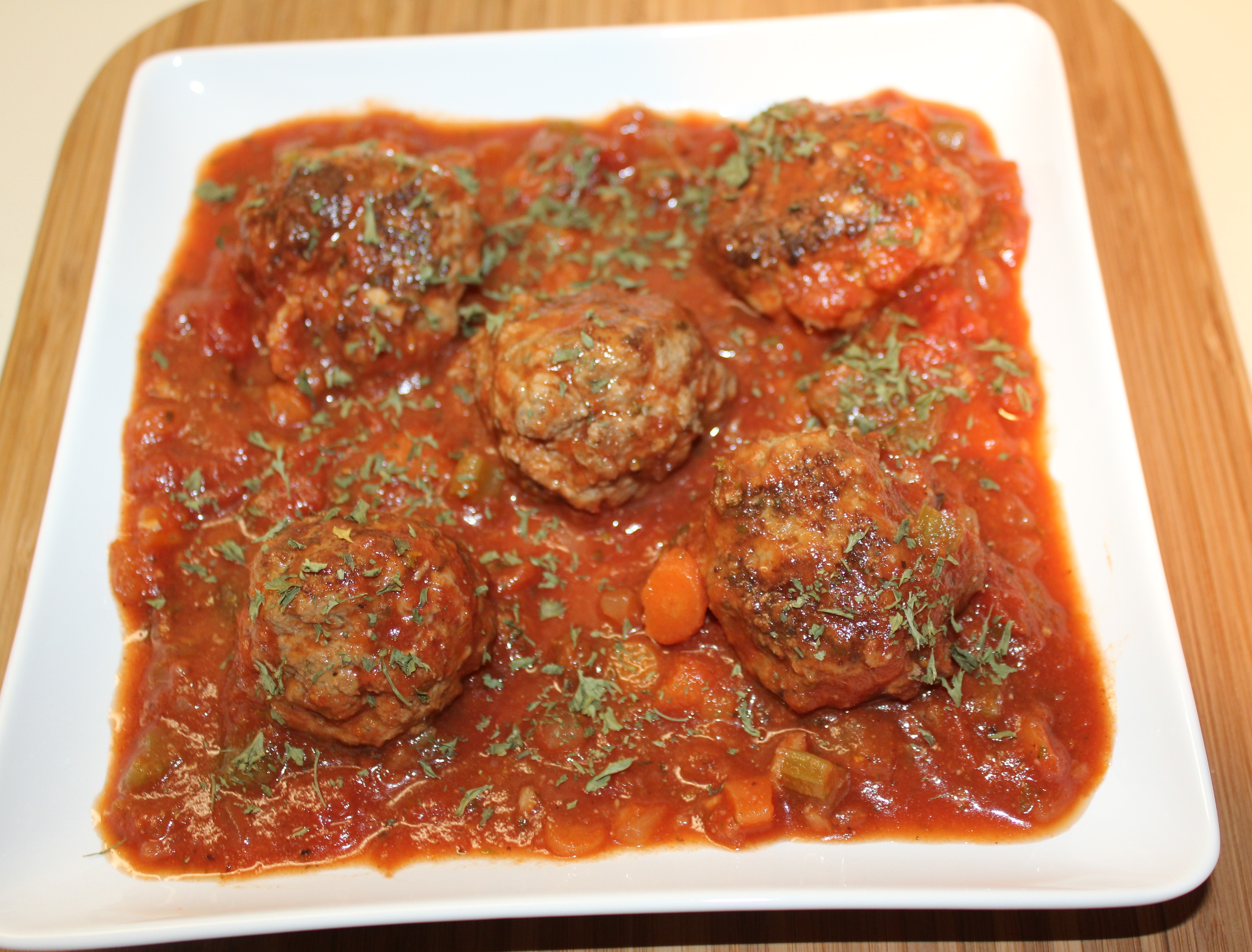 This wonderful meatball recipe is based loosely on the one found in Marcella Hazan’s Essentials of Classic Italian Cooking (New York: Alfred A. Knopf, 1993.) Some of my main changes are to add ground pork and include some additional seasonings, plus eliminate the dry bread crumbs that Hazan rolls the meatballs in before cooking. The result – magnifico!