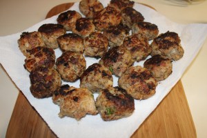 Once you have your seasonings down pat, go ahead and heat the olive oil and sauté the rest of the meatballs over medium heat until they are nice and brown on the outside. Place on paper towels to absorb the oil once they are finished cooking.