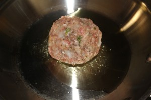 Tip: Now what you want to do is to cook one meatball in a little bit of the olive oil over medium heat for a few minutes on each side. That’s right – just one meatball for now. This is because you want to know how the mixture tastes before cooking all of it so that you can adjust the seasoning if necessary. (Thanks to Isaac Becker of 112 Eatery in Minneapolis for this tip, as mentioned in my 5/16/11 post.)