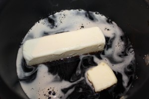 Heat the Guinness and butter on low in a medium sauce pan. Transfer to a large mixing bowl as soon as the butter has melted.