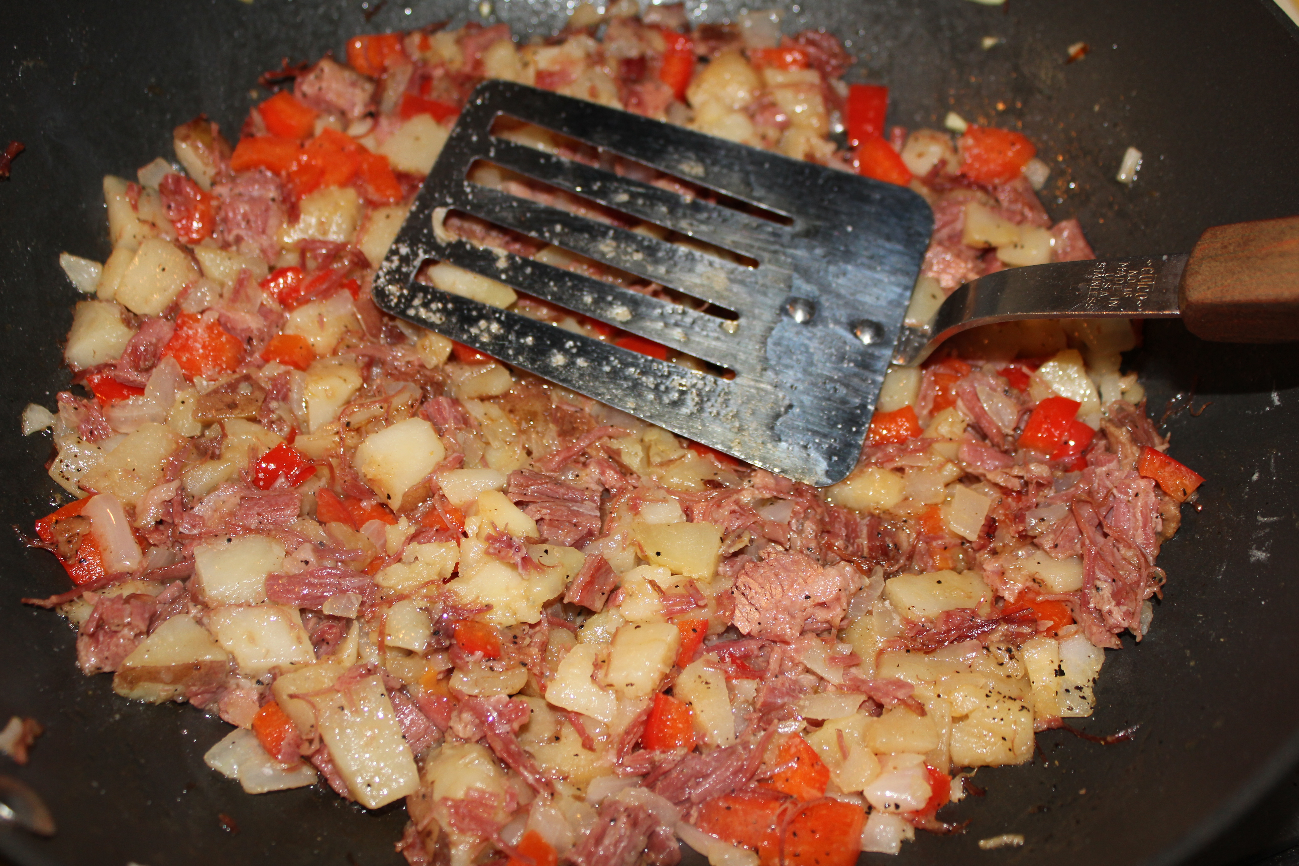 Add the corned beef and potatoes and mix together well. Add the pepper and a little bit of salt (remember, the corned beef is already salty, so go easy.)
