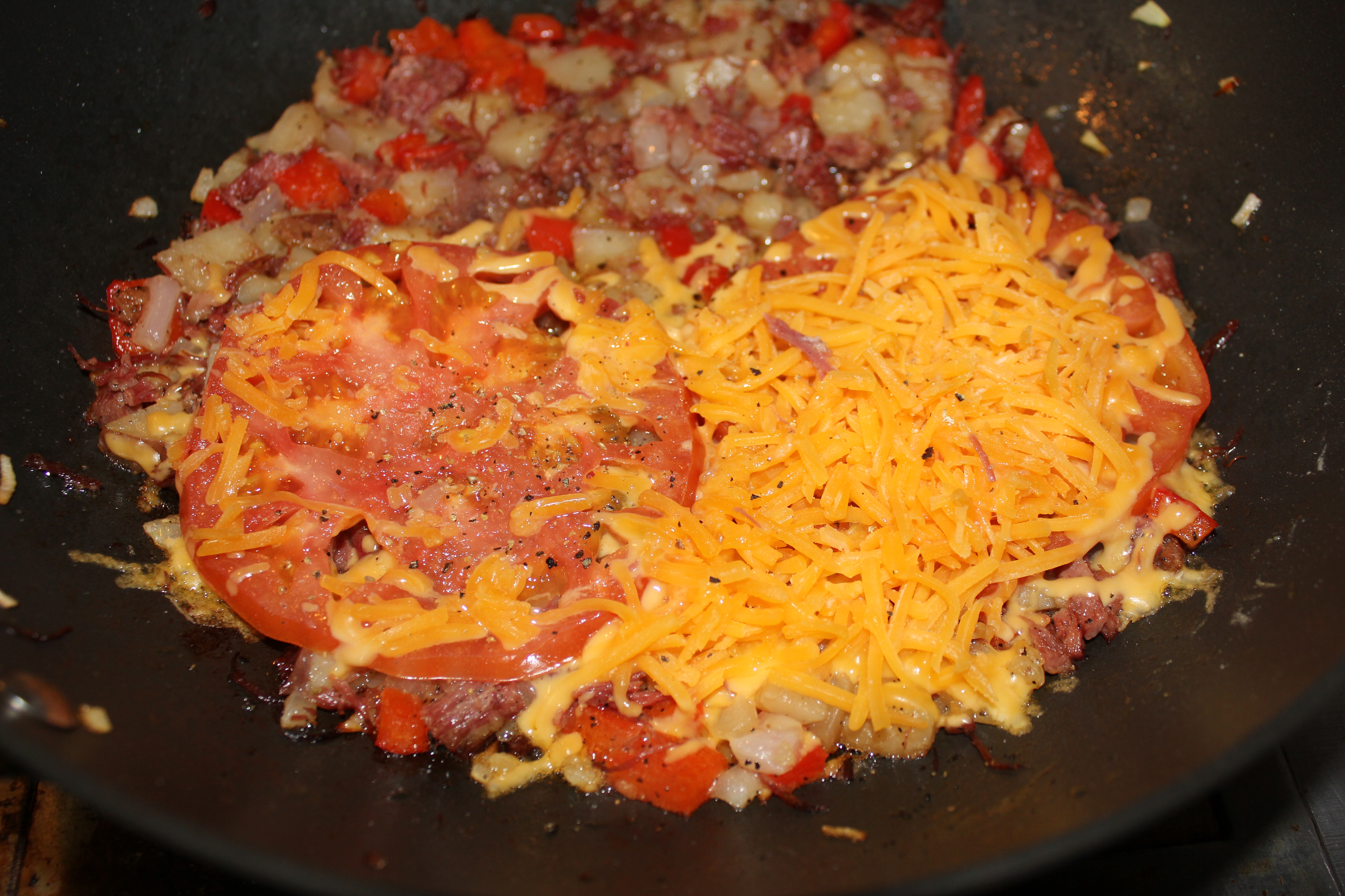 This is when I like to add a few slices of tomato and sprinkle the top with sharp cheddar cheese. Cook until the cheese has melted. Serve with a fried egg on the side and some sort of bread.