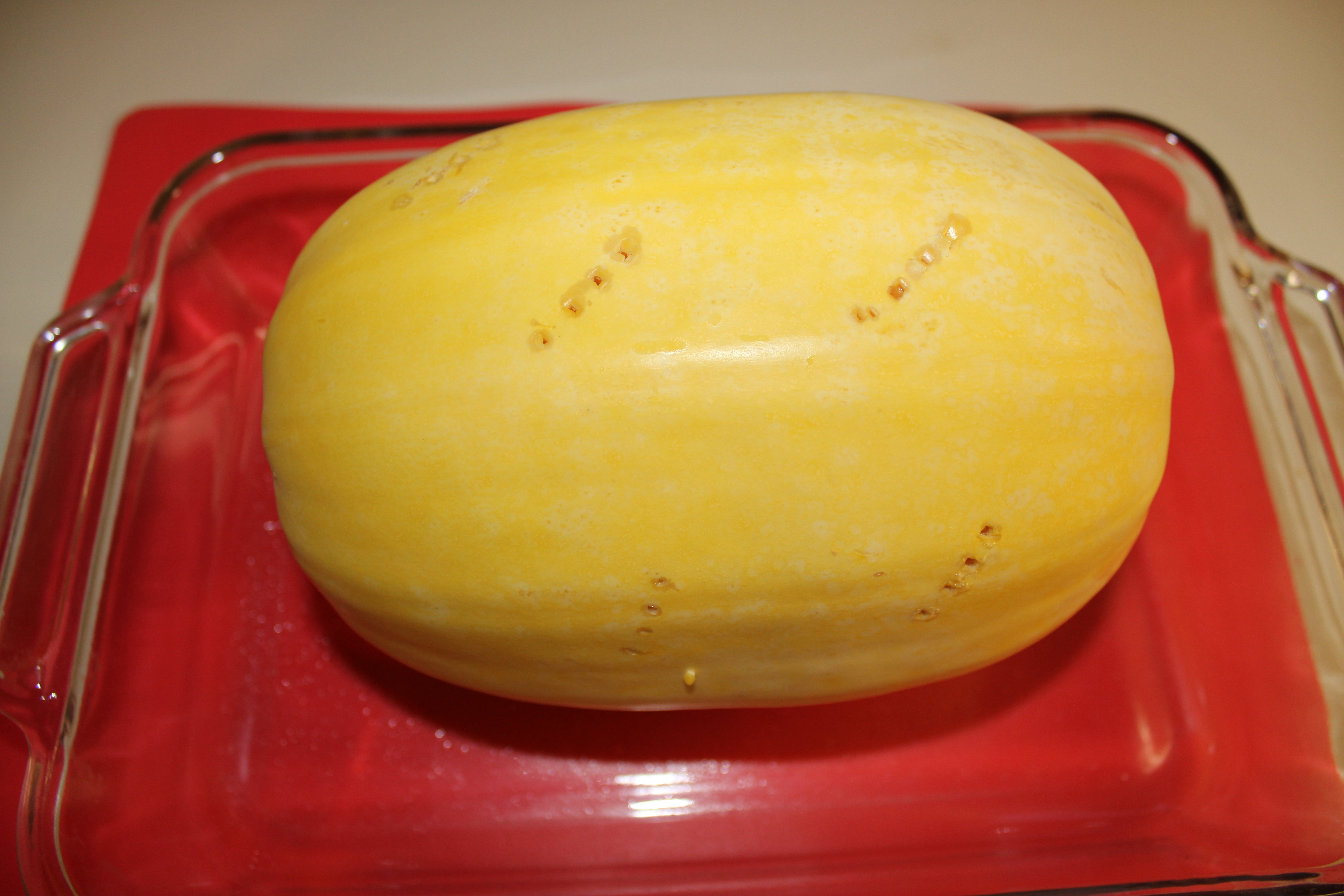 Prick the spaghetti squash with a fork so it will not burst while baking. Place it in a shallow baking pan. Bake for 1 hour. When the squash is cool enough to handle, cut it in half lengthwise.