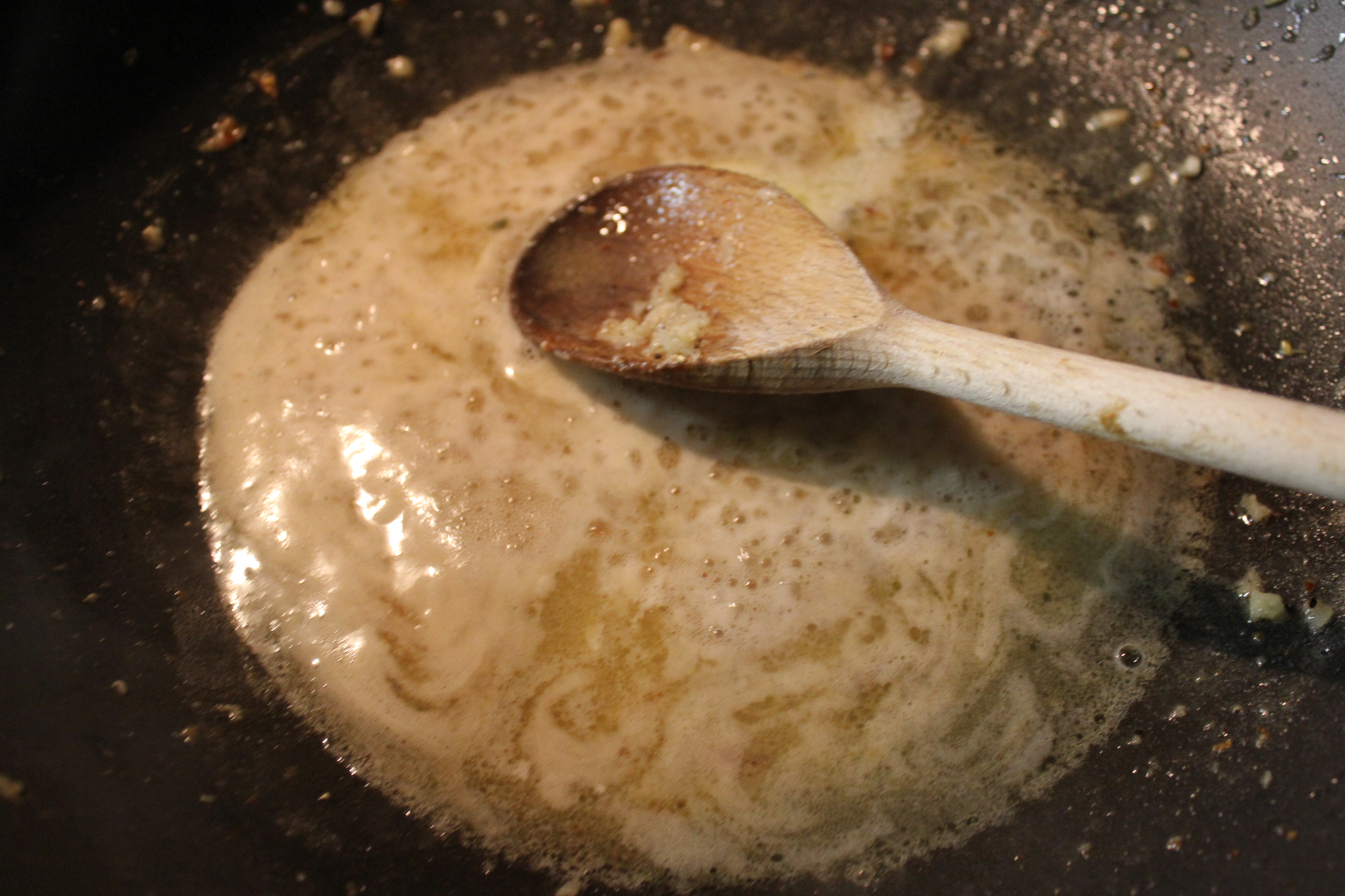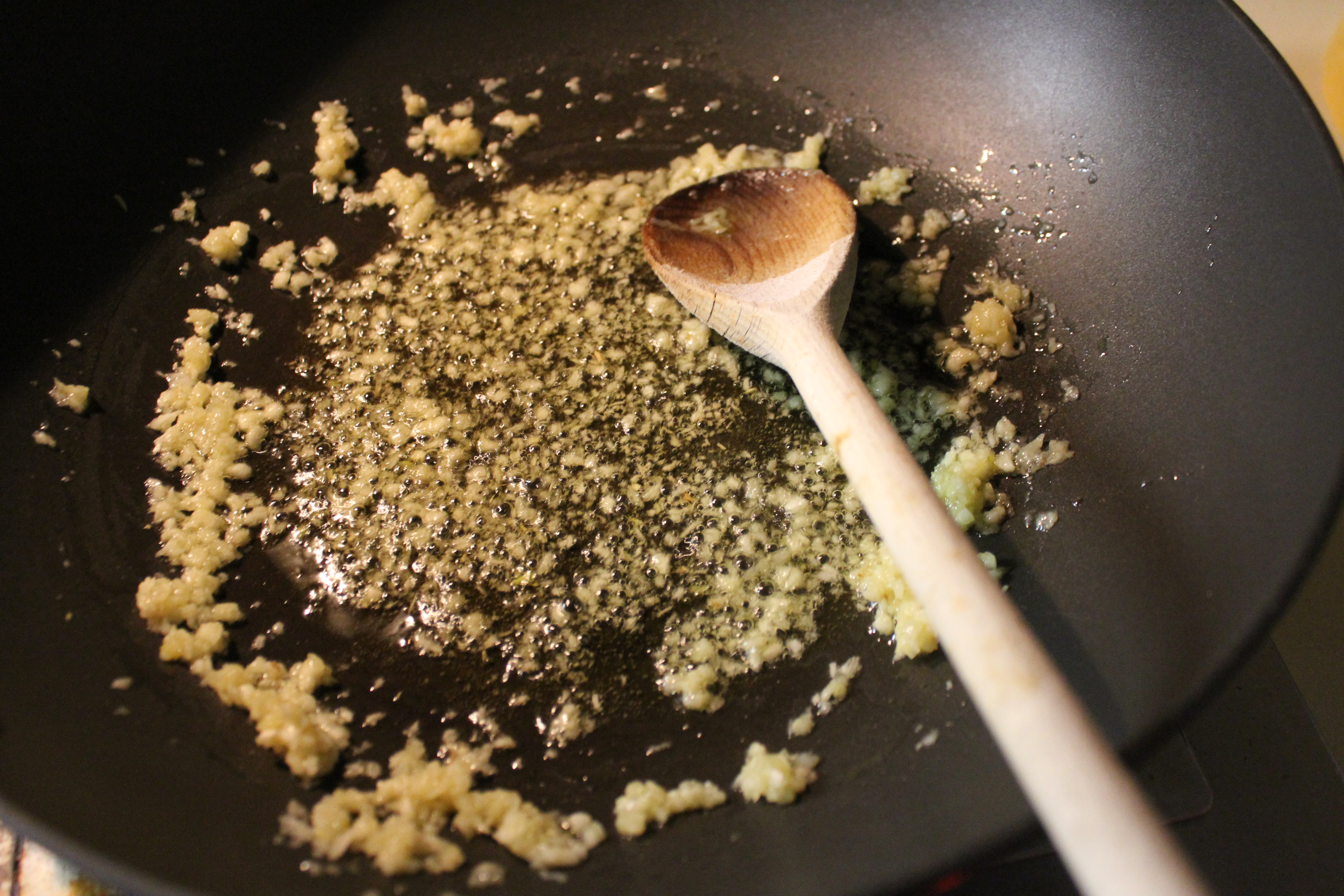 Heat the olive oil in a large skillet. Add the minced garlic and sauté for a minute or two, making sure not to overcook it.