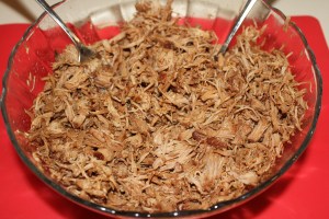Let the pork cool, and then strain it from the rest of the ingredients with a slotted spoon and place it in a large bowl. Shred it with two forks – it should come apart quite easily.