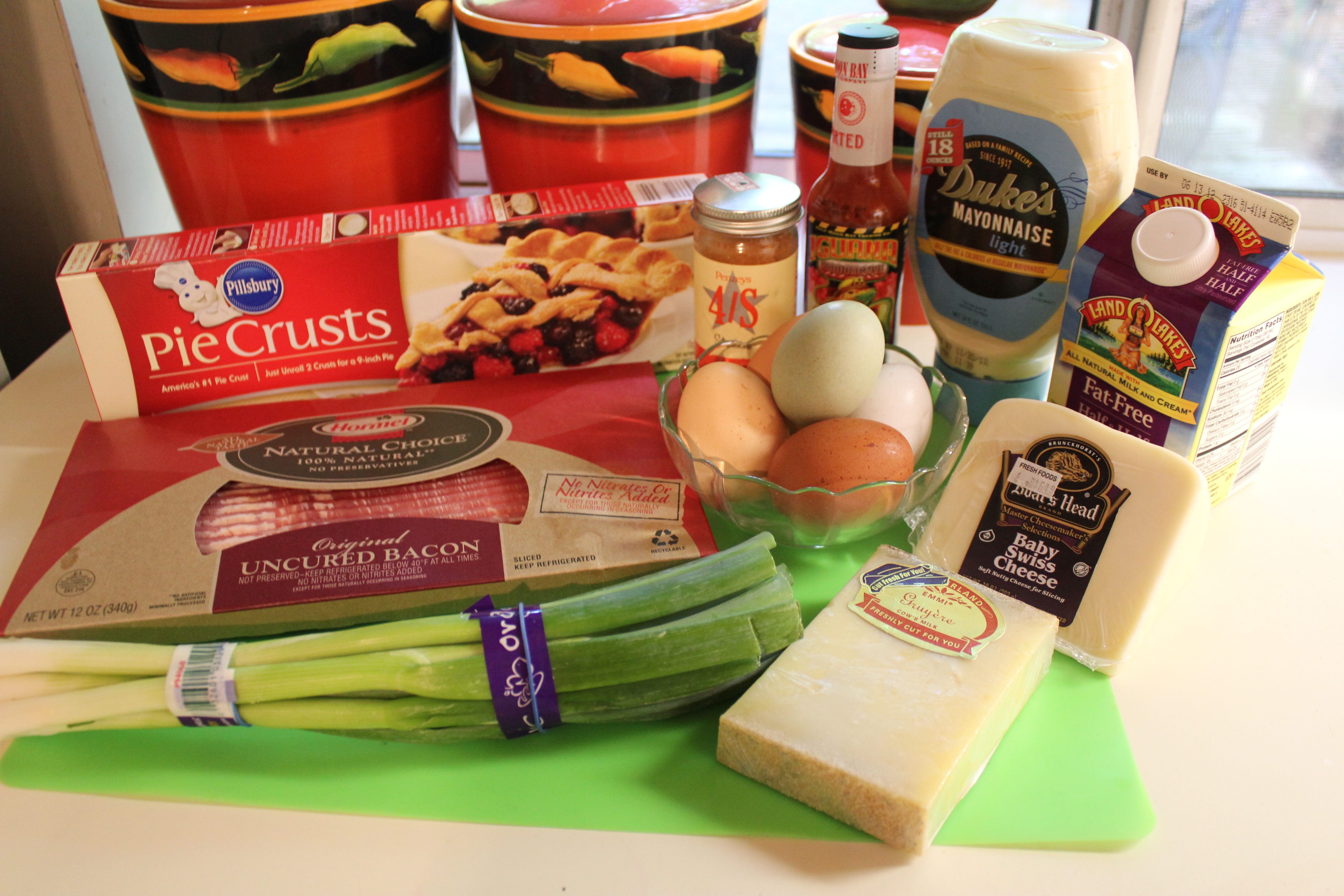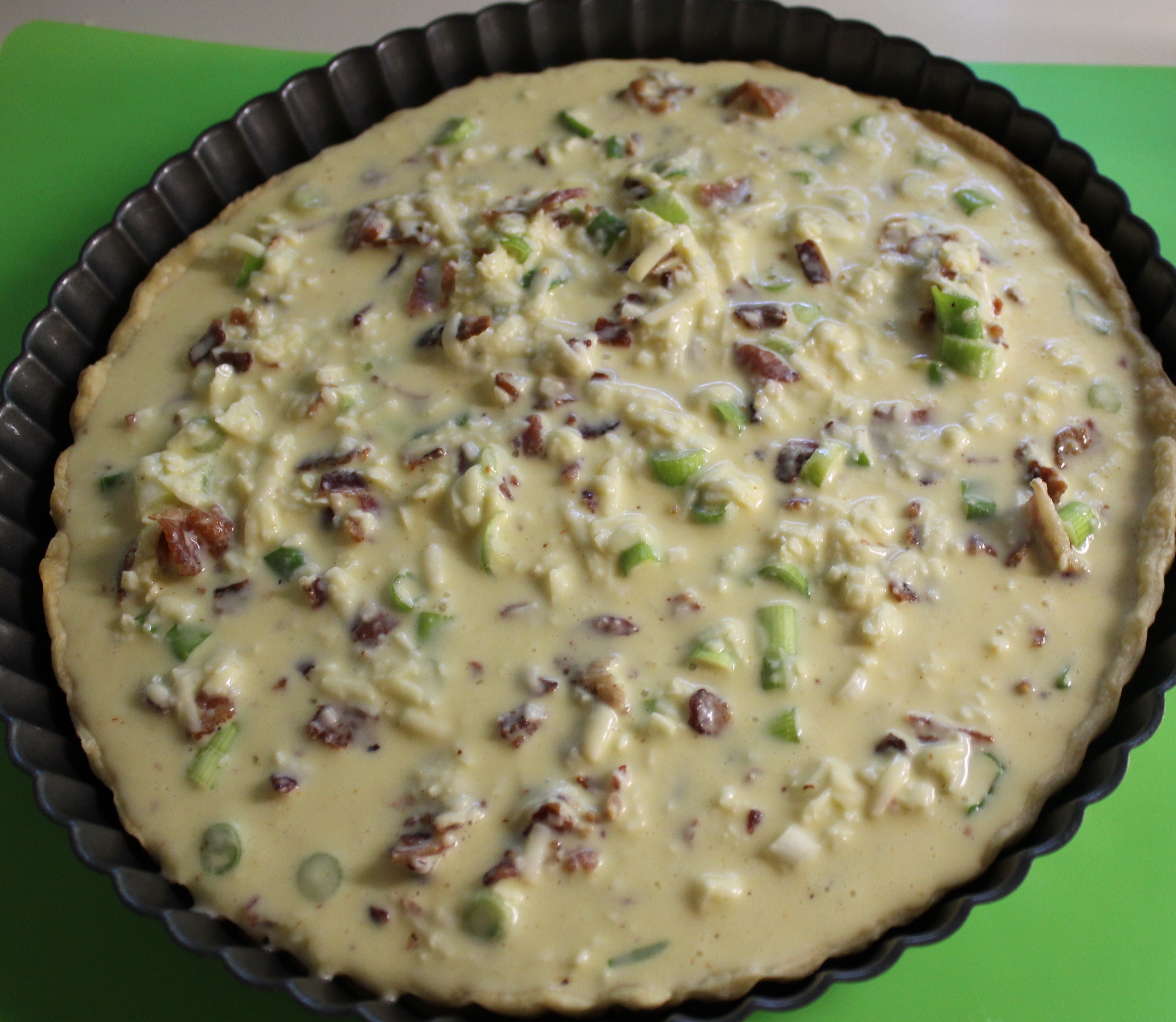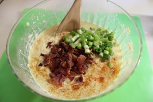 In a large bowl, whisk the eggs and add the half and half and mayo until nice and creamy. Blend in the cheeses, salt, pepper/hot sauce, scallions and bacon.