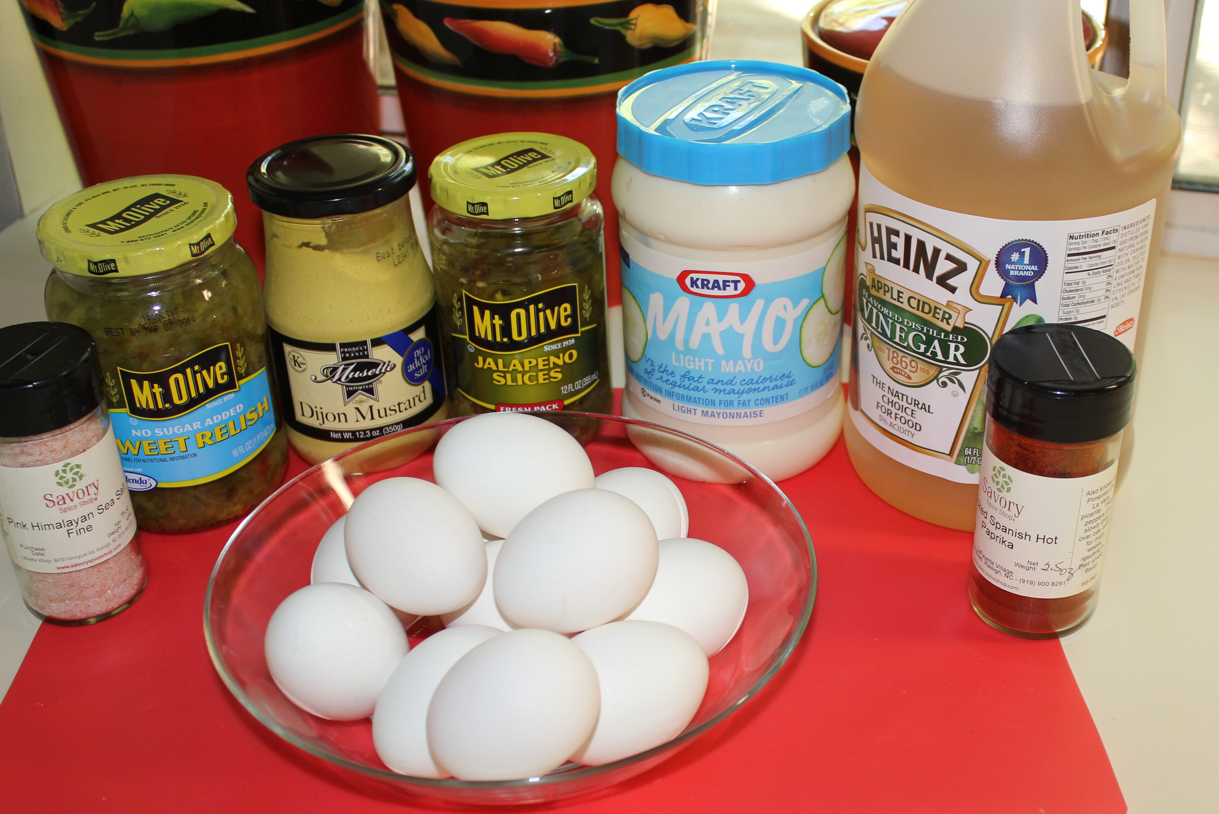- One dozen eggs, hard boiled